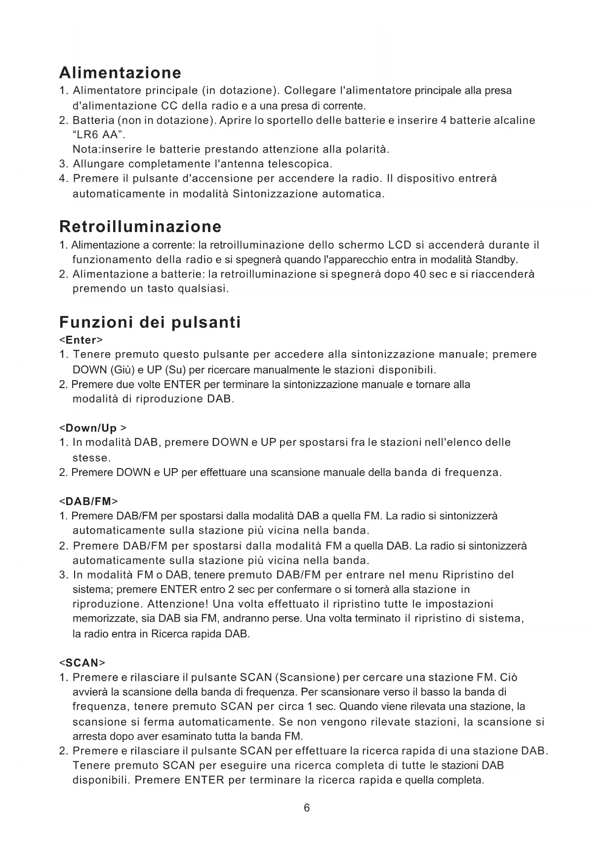 - Tenere premuto questo pulsante per accedere alla sintonizzazione manuale; premere DOWN (Giù) e UP (Su) per ricercare manualmente le stazioni disponibili.