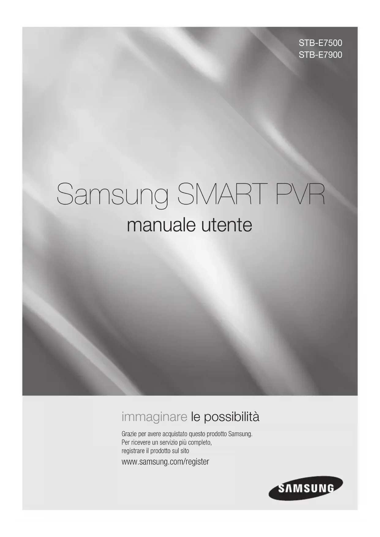Web Site France 01 48 63 00 00 www.samsung.com 02032J-STB-E7900-EN-FRA.indd 71 2012-04-13 오후 3:03:26immaginare le possibilità Grazie per avere acquistato questo prodotto Samsung. Per ricevere un servizio più completo, registrare il prodotto sul sito www.samsung.com/register Samsung SMART PVR manuale utente STB-E7500 STB-E7900 02032J-STB-E7900-EN-ITA.indd 1 2012-04-13 오후 3:27:26Informazioni sulla sicurezza Non installare l’apparecchio in uno spazio ristretto, ad esempio una libreria o un luogo analogo.AVVERTENZA• Per evitare danni che potrebbero provocare incendi o scosse elettriche, non esporre l'apparecchiatura alla pioggia o all'umidità.NOTA IMPORTANTEIl conduttore isolato di corrente di questa apparecchiatura è fornito con una spina pressofusa dotata di fusibile. Il valore del fusibile è indicato sul lato dei poli della spina. In caso di sostituzione, utilizzare un fusibile approvato BS1362 avente la stessa potenza nominale.Non utilizzare mai la spina senza coperchio del fusibile, se questo è rimovibile. Se occorre sostituire il coperchio del fusibile, è necessario utilizzarne uno dello stesso colore del lato dei poli della spina. I coperchi di ricambio sono disponibili presso i rivenditori.Se la spina in dotazione non è adatta alle prese della propria abitazione o se il cavo non è sufficientemente lungo per raggiungere una presa di corrente, occorre acquistare un apposito cavo di prolunga di sicurezza approvato o rivolgersi al rivenditore per assistenza.Tuttavia, se non vi è alternativa all’eliminazione della spina, rimuovere il fusibile e smaltire la spina in modo sicuro. Non collegare la spina a una presa qualora il cavo presenti parti scoperte poiché ciò può causare rischi di scosse elettriche.Per scollegare l’apparecchio dalla rete è necessario estrarre la spina dalla presa: pertanto la spina dev’essere facilmente accessibile.L’unità di prodotto accompagnata da questo manuale utente è concessa in licenza in base a determinati diritti di proprietà intellettuale di determinate terze parti. Precauzioni Informazioni importanti sulla sicurezza Prima di utilizzare l'unità, leggere attentamente le seguenti istruzioni per l'uso. Seguire tutte le istruzioni per la sicurezza elencate di seguito. Conservare le istruzioni per l'uso per riferimento futuro.1. Leggere queste istruzioni.2. Conservare queste istruzioni. Prestare attenzione a tutti i messaggi d'avviso.4. Seguire tutte le istruzioni.5. Non utilizzare questo apparecchio vicino all'acqua.6. Pulire solo con un panno asciutto.7. Non ostruire le aperture per la ventilazione. Eseguire l'installazione secondo le istruzioni del produttore.8. Non installare vicino a fonti di calore come caloriferi, bocchette di riscaldamento, stufe o altri apparecchi (compresi ricevitori AV) che generino calore.