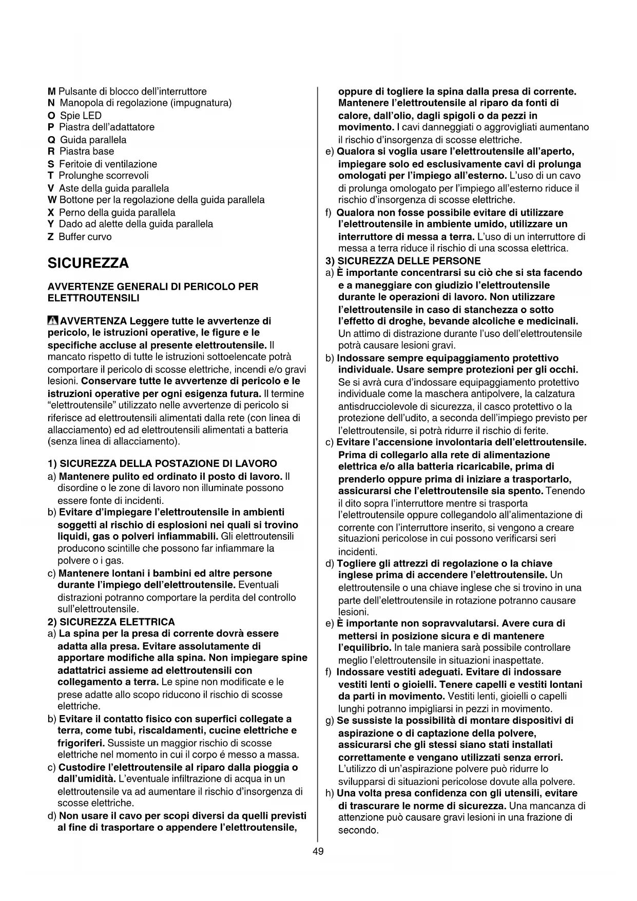 - Leggete e conservate questo manuale di istruzione 3 DATI TECNICI 1 ELEMENTI UTENSILE 2 A Bloccaggio dell’albero B Dado colletto C Chiave D Asta di profondità E Manopola di regolazione ne F Torretta con fermi di profondità G Manopola di regolazione (asta di profondità) H Leva di blocco J Rotella selezione velocità K Prolunga per aspirapolvere L Interruttore di acceso/spento49 M Pulsante di blocco dell’interruttore N Manopola di regolazione (impugnatura) O Spie LED P Piastra dell’adattatore Q Guida parallela R Piastra base S Feritoie di ventilazione T Prolunghe scorrevoli V Aste della guida parallela W Bottone per la regolazione della guida parallela X Perno della guida parallela Y Dado ad alette della guida parallela Z Buer curvo SICUREZZA