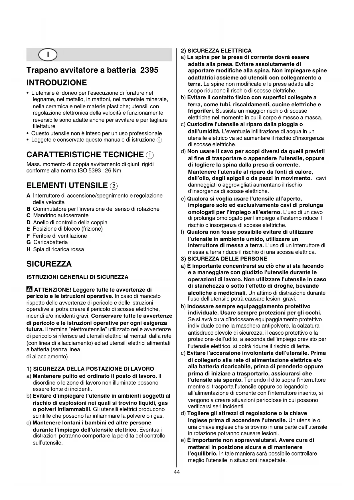 - Leggete e conservate questo manuale di istruzione 3 CARATTERISTICHE TECNICHE 1 Mass. momento di coppia avvitamento di giunti rigidi conforme alla norma ISO 5393 : 26 Nm ELEMENTI UTENSILE 2 A Interruttore di accensione/spegnimento e regolazione della velocità B Commutatore per l’inversione del senso di rotazione C Mandrino autoserrante D Anello di controllo della coppia E Posizione di blocco (frizione) F Feritoie di ventilazione G Caricabatteria H Spia di ricarica rossa SICUREZZA