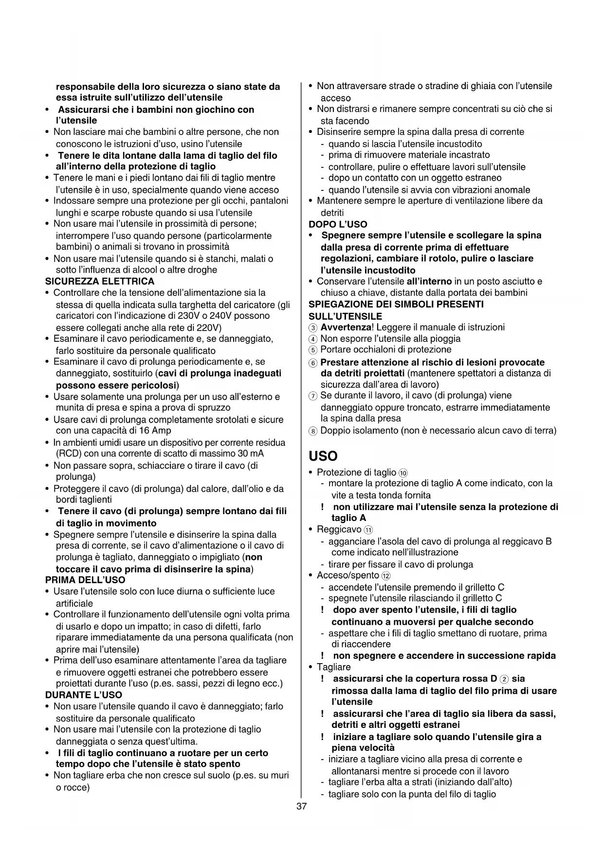 - Tagliare ! assicurarsichelacoperturarossaD2sia rimossadallalamaditagliodelfiloprimadiusare l’utensile ! assicurarsichel’areaditagliosialiberadasassi, detritiealtrioggettiestranei ! iniziareatagliaresoloquandol’utensilegiraa pienavelocità - iniziare a tagliare vicino alla presa di corrente e allontanarsi mentre si procede con il lavoro - tagliare l’erba alta a strati (iniziando dall’alto) - tagliare solo con la punta del lo di taglio38 - non tagliare erba umida o bagnata - evitare che l’erba tagliata ostruisca il rotolo (non eettuare tagli pesanti) - non sovraccaricare l’utensile - fare attenzione quando si taglia attorno ad alberi e arbusti, evitando di vengano a contatto con i li di taglio - tenere l’utensile lontano dagli oggetti solidi per proteggere i li di taglio da un’eccessiva usura - fare attenzione al contraccolpo, quando si entra in contatto con oggetti solidi