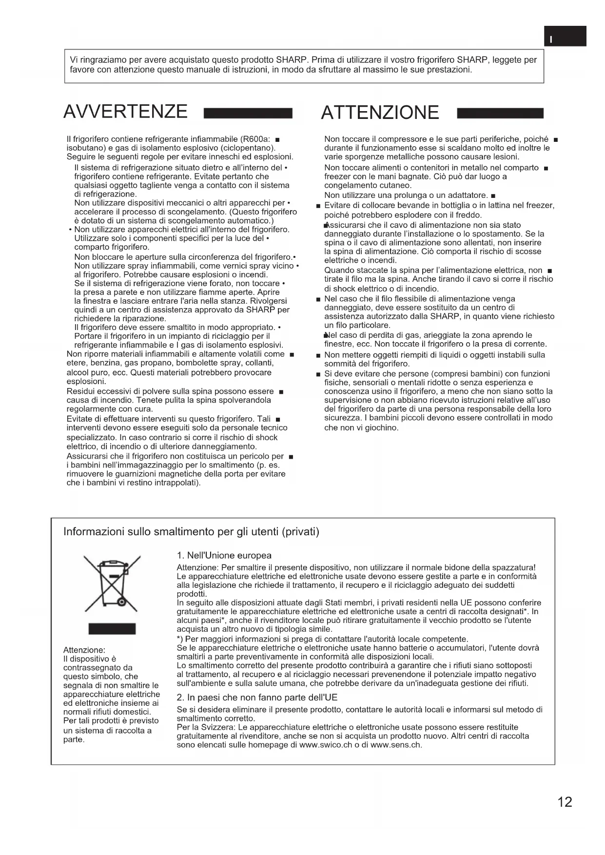 EE12 Vi ringraziamo per avere acquistato questo prodotto SHARP. Prima di utilizzare il vostro frigorifero SHARP, leggete per favore con attenzione questo manuale di istruzioni, in modo da sfruttare al massimo le sue prestazioni. Il frigorifero contiene refrigerante infiammabile (R600a: ■isobutano) e gas di isolamento esplosivo (ciclopentano). Seguire le seguenti regole per evitare inneschi ed esplosioni.Il sistema di refrigerazione situato dietro e all’interno del • frigorifero contiene refrigerante. Evitate pertanto che qualsiasi oggetto tagliente venga a contatto con il sistema di refrigerazione.Non utilizzare dispositivi meccanici o altri apparecchi per • accelerare il processo di scongelamento. (Questo frigorifero è dotato di un sistema di scongelamento automatico.) Non utilizzare apparecchi elettrici all'interno del frigorifero.• Utilizzare solo i componenti specifici per la luce del • comparto frigorifero.Non bloccare le aperture sulla circonferenza del frigorifero.• Non utilizzare spray infiammabili, come vernici spray vicino • al frigorifero. Potrebbe causare esplosioni o incendi.Se il sistema di refrigerazione viene forato, non toccare • la presa a parete e non utilizzare fiamme aperte. Aprire la finestra e lasciare entrare l'aria nella stanza. Rivolgersi quindi a un centro di assistenza approvato da SHARP per richiedere la riparazione.Il frigorifero deve essere smaltito in modo appropriato. • Portare il frigorifero in un impianto di riciclaggio per il refrigerante infiammabile e I gas di isolamento esplosivi.Non riporre materiali infiammabili e altamente volatili come ■etere, benzina, gas propano, bombolette spray, collanti, alcool puro, ecc. Questi materiali potrebbero provocare esplosioni.Residui eccessivi di polvere sulla spina possono essere ■causa di incendio. Tenete pulita la spina spolverandola regolarmente con cura.Evitate di effettuare interventi su questo frigorifero. Tali ■interventi devono essere eseguiti solo da personale tecnico specializzato. In caso contrario si corre il rischio di shock elettrico, di incendio o di ulteriore danneggiamento.Assicurarsi che il frigorifero non costituisca un pericolo per ■i bambini nell’immagazzinaggio per lo smaltimento (p. es. rimuovere le guarnizioni magnetiche della porta per evitare che i bambini vi restino intrappolati). AVVERTENZE ATTENZIONE Non toccare il compressore e le sue parti periferiche, poiché ■durante il funzionamento esse si scaldano molto ed inoltre le varie sporgenze metalliche possono causare lesioni.Non toccare alimenti o contenitori in metallo nel comparto ■freezer con le mani bagnate. Ciò può dar luogo a congelamento cutaneo.Non utilizzare una prolunga o un adattatore. ■ Evitare di collocare bevande in bottiglia o in lattina nel freezer, ■ poiché potrebbero esplodere con il freddo.Assicurarsi che il cavo di alimentazione non sia stato ■danneggiato durante l’installazione o lo spostamento. Se la spina o il cavo di alimentazione sono allentati, non inserire la spina di alimentazione. Ciò comporta il rischio di scosse elettriche o incendi.Quando staccate la spina per l’alimentazione elettrica, non ■tirate il filo ma la spina. Anche tirando il cavo si corre il rischio di shock elettrico o di incendio. Nel caso che il filo flessibile di alimentazione venga ■ danneggiato, deve essere sostituito da un centro di assistenza autorizzato dalla SHARP, in quanto viene richiesto un filo particolare.Nel caso di perdita di gas, arieggiate la zona aprendo le ■finestre, ecc. Non toccate il frigorifero o la presa di corrente. Non mettere oggetti riempiti di liquidi o oggetti instabili sulla ■ sommità del frigorifero. Si deve evitare che persone (compresi bambini) con funzioni ■ fisiche, sensoriali o mentali ridotte o senza esperienza e conoscenza usino il frigorifero, a meno che non siano sotto la supervisione o non abbiano ricevuto istruzioni relative all’uso del frigorifero da parte di una persona responsabile della loro sicurezza. I bambini piccoli devono essere controllati in modo che non vi giochino. Informazioni sullo smaltimento per gli utenti (privati)