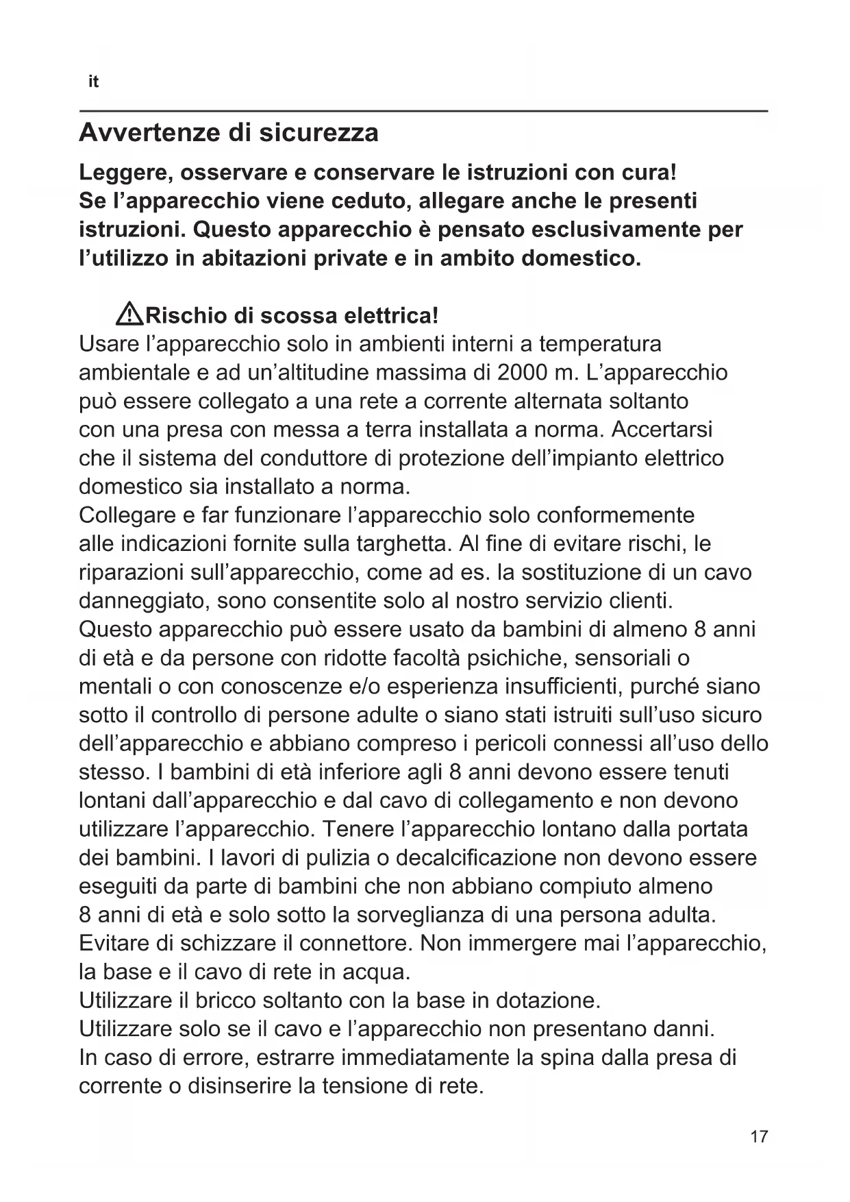 Avvertenze di sicurezza Leggere, osservare e conservare le istruzioni con cura! Se l’apparecchio viene ceduto, allegare anche le presenti istruzioni. Questo apparecchio è pensato esclusivamente per l’utilizzo in abitazioni private e in ambito domestico. WRischio di scossa elettrica! Usare l’apparecchio solo in ambienti interni a temperatura ambientale e ad un’altitudine massima di 2000 m. L’apparecchio può essere collegato a una rete a corrente alternata soltanto con una presa con messa a terra installata a norma. Accertarsi che il sistema del conduttore di protezione dell’impianto elettrico domestico sia installato a norma. Collegare e far funzionare l’apparecchio solo conformemente alle indicazioni fornite sulla targhetta. Al ne di evitare rischi, le riparazioni sull’apparecchio, come ad es. la sostituzione di un cavo danneggiato, sono consentite solo al nostro servizio clienti. Questo apparecchio può essere usato da bambini di almeno 8 anni di età e da persone con ridotte facoltà psichiche, sensoriali o mentali o con conoscenze e/o esperienza insucienti, purché siano sotto il controllo di persone adulte o siano stati istruiti sull’uso sicuro dell’apparecchio e abbiano compreso i pericoli connessi all’uso dello stesso. I bambini di età inferiore agli 8 anni devono essere tenuti lontani dall’apparecchio e dal cavo di collegamento e non devono utilizzare l’apparecchio. Tenere l’apparecchio lontano dalla portata dei bambini. I lavori di pulizia o decalcicazione non devono essere eseguiti da parte di bambini che non abbiano compiuto almeno 8 anni di età e solo sotto la sorveglianza di una persona adulta. Evitare di schizzare il connettore. Non immergere mai l’apparecchio, la base e il cavo di rete in acqua. Utilizzare il bricco soltanto con la base in dotazione. Utilizzare solo se il cavo e l’apparecchio non presentano danni. In caso di errore, estrarre immediatamente la spina dalla presa di corrente o disinserire la tensione di rete.18