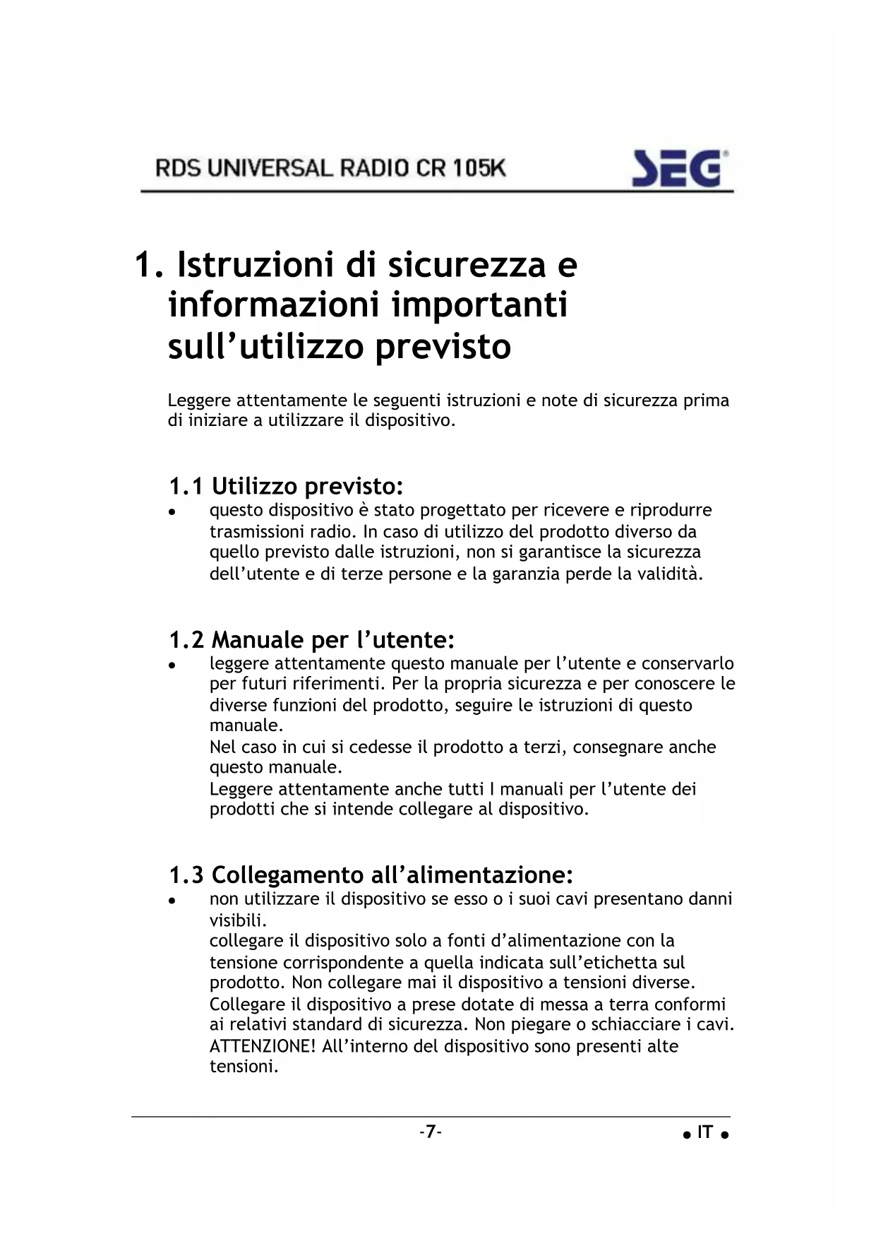 Scarica le istruzioni per il tuo Radio in formato PDF gratuitamente! Trova il tuo manuale CR 105K - SEG e riprendi in mano il tuo dispositivo elettronico. In questa pagina sono pubblicati tutti i documenti necessari per l'utilizzo del tuo dispositivo. CR 105K del marchio SEG.