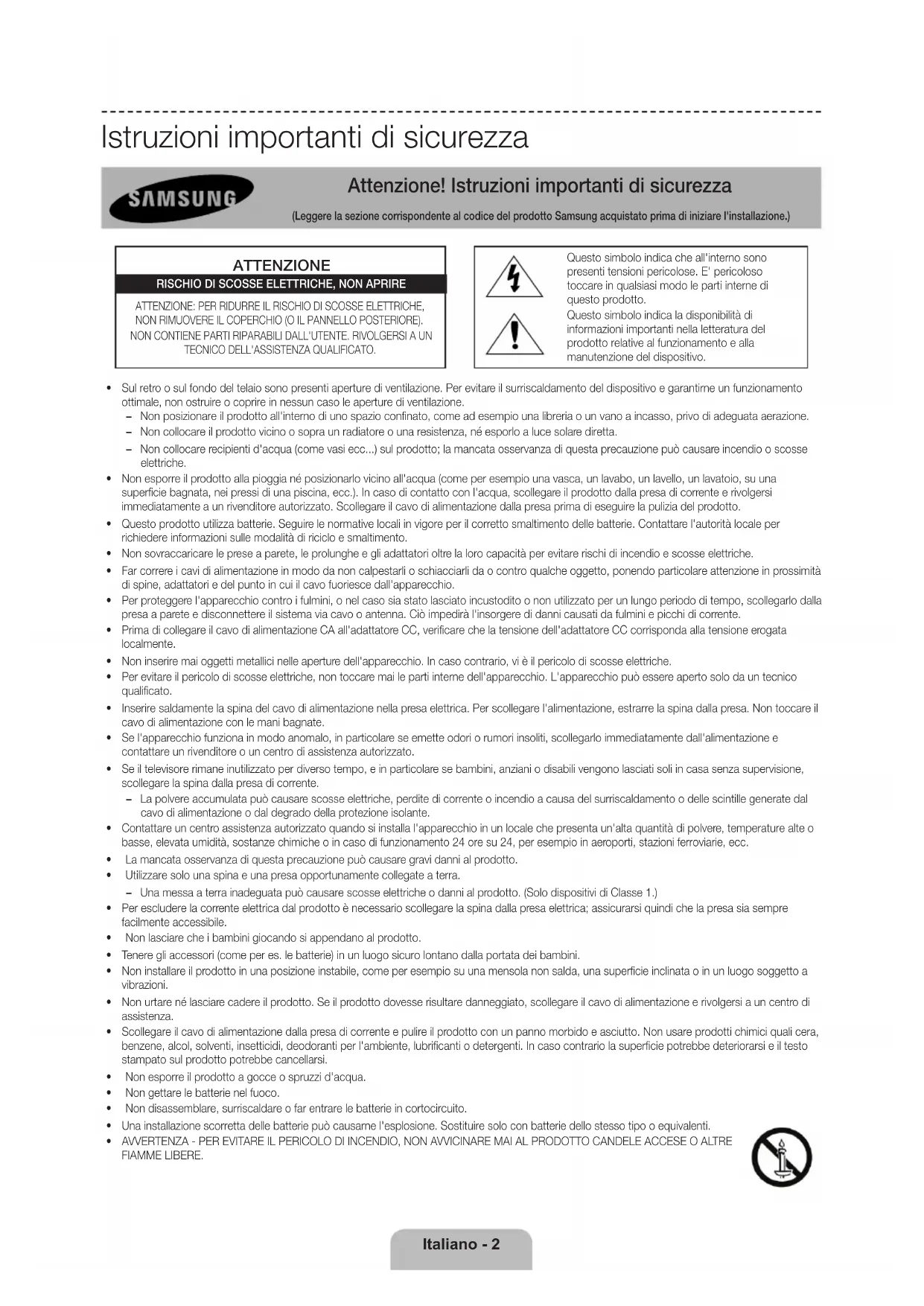 • AVVERTENZA - PER EVITARE IL PERICOLO DI INCENDIO, NON AVVICINARE MAI AL PRODOTTO CANDELE ACCESE O ALTRE FIAMME LIBERE.