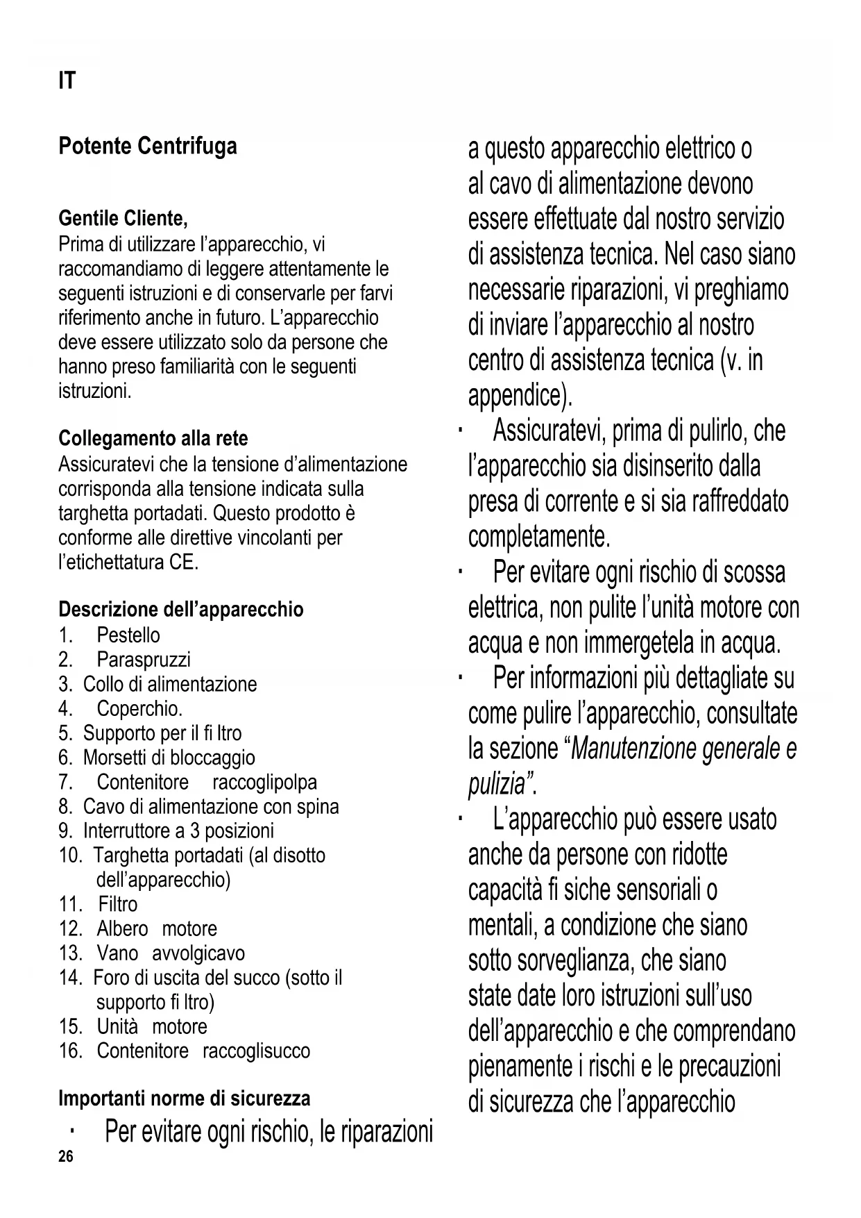 Importanti norme di sicurezza ∙ Per evitare ogni rischio, le riparazioni a questo apparecchio elettrico o al cavo di alimentazione devono essere effettuate dal nostro servizio di assistenza tecnica. Nel caso siano necessarie riparazioni, vi preghiamo di inviare l’apparecchio al nostro centro di assistenza tecnica (v. in appendice). ∙ Assicuratevi, prima di pulirlo, che l’apparecchio sia disinserito dalla presa di corrente e si sia raffreddato completamente. ∙ Per evitare ogni rischio di scossa elettrica, non pulite l’unità motore con acqua e non immergetela in acqua. ∙ Per informazioni più dettagliate su come pulire l’apparecchio, consultate la sezione “Manutenzione generale e pulizia”. ∙ L’apparecchio può essere usato anche da persone con ridotte capacità fi siche sensoriali o mentali, a condizione che siano sotto sorveglianza, che siano state date loro istruzioni sull’uso dell’apparecchio e che comprendano pienamente i rischi e le precauzioni di sicurezza che l’apparecchio IT27 comporta. ∙ Ai bambini non deve essere consentito l’utilizzo dell’apparecchio. L’apparecchio e il cavo di alimentazione devono essere tenuti fuori della portata dei bambini. ∙ Ai bambini non deve essere consentito di giocare con l’apparecchio. ∙ Avvertenza: Tutto il materiale di imballaggio deve essere tenuto fuori della portata dei bambini a causa del rischio potenziale esistente, per esempio di soffocamento. ∙ Prima di ogni utilizzo dell’apparecchio, controllate attentamente che l’apparecchio e gli accessori inseriti non presentino tracce di deterioramento. Se per esempio fosse caduto battendo su una superfi cie dura, o se è stata usata una forza eccessiva nel tirare il cavo di alimentazione, l’apparecchio non va più usato: danni anche invisibili ad occhio nudo potrebbero comportare conseguenze negative sulla sicurezza nel funzionamento dell’apparecchio. ∙ Non lasciate mai l’apparecchio incustodito quando è collegato all’alimentazione elettrica. Disinserite sempre la spina dalla presa di corrente a muro anche se lasciate la stanza solo per un breve lasso di tempo. ∙ Per sicurezza, usate sempre il pestello per inserire la frutta o gli ortaggi nel collo di alimentazione. Non inserite mai, in nessun caso, mani o dita. ∙ Avvertenza: sul fi ltro ci sono punte taglienti. Per evitare infortuni prestate sempre estrema cautela quando lo svuotate. ∙ Dopo aver spento l’apparecchio, aspettate sempre che il motore si sia arrestato completamente prima di aprire il coperchio. ∙ Non lasciate l’apparecchio o il cavo di alimentazione a contatto con superfi ci calde o con una qualsiasi fonte di calore. ∙ Disinserite sempre la spina dalla presa di corrente a muro - prima di montare o smontare l’apparecchio, - dopo l’uso, - in caso di cattivo funzionamento, - prima di aprire il coperchio, - prima di pulire l’apparecchio. ∙ Per disinserire la spina dalla presa di corrente, non tirate mai il cavo di alimentazione, ma afferrate direttamente la spina. Non lasciate pendere liberamente il cavo di alimentazione. ∙ Non mettete in funzione l’apparecchio se notate segni di danneggiamento sul fi ltro rotante. ∙ Nessuna responsabilità verrà assunta in caso di danni risultanti da un uso improprio o dalla non conformità alle istruzioni. Avvertenza: Il cattivo uso può essere causa di gravi lesioni alla persona. ∙ Questo apparecchio è studiato per il solo uso domestico o per impieghi simili, come per esempio - negozi, uffi ci e altri ambienti simili di lavoro, - aziende agricole, - clienti di alberghi, motel e stabilimenti simili, - clienti di pensioni “bed-and-breakfast” (letto & colazione).28 Informazioni utili ∙ Per sistemare saldamente l’apparecchio, prima di metterlo in funzione vi consigliamo di premere leggermente l’apparecchio sul piano di lavoro in modo da assicurarvi che i piedini a ventosa si fi ssino saldamente sulla superfi cie. ∙ Spezzettate la frutta o gli ortaggi in modo che si adattino alle dimensioni del collo di alimentazione; eliminate tutti i noccioli, semi o torsoli per evitare di danneggiare l’apparecchio. ∙ I seguenti frutti e ortaggi non si prestano all’estrazione di succo: fi chi, uva, avocado, melanzane, lamponi, more, ribes, bacche di sambuco, rabarbaro, mirtilli, frutti della vitidea ecc. ∙ I pomodori vanno pelati leggermente con un coltello prima di estrarne il succo. ∙ È possibile aggiungere anche banane sbucciate, ma solo per dare profumo perché dalle banane si estrae solo una quantità minima di succo. Utilizzo a brevi intervalli L’apparecchio è stato ideato solo per un utilizzo a intervalli di breve durata, vale a dire che non può essere tenuto in funzione per più di un minuto di seguito. Lasciatelo raffreddare suffi cientemente prima di rimetterlo in funzione. Scatto termico di sicurezza Questo apparecchio è dotato di un interruttore a scatto termico di sicurezza che spegne automaticamente l’apparecchio in caso di surriscaldamento. Se dovesse attivarsi, lasciate che l’apparecchio si raffreddi sino alla temperatura ambiente prima di rimetterlo in funzione. Vano avvolgicavo Nella parte posteriore dell’apparecchio c’è il vano per conservare il cavo. Prima dell’uso, aprite il vano e svolgete il cavo di alimentazione sino alla lunghezza desiderata. Primo utilizzo dell’apparecchio Al primo utilizzo dell’apparecchio, lavatelo nel modo indicato nella sezione “Manutenzione generale e pulizia”. Interruttore L’apparecchio è dotato di un interruttore a 3 posizioni. 0 apparecchio spento 1 estrazione lenta di succo 2 estrazione rapida di succo Vi consigliamo di cominciare con l’impostazione per l’estrazione lenta e di passare all’estrazione rapida solo se necessario. Funzionamento ∙ Inserite i due contenitori, quello per la raccolta del succo e quello per la polpa. ∙ Sistemate il supporto per il fi ltro sull’albero motore, accertandovi che la piccola apertura di 