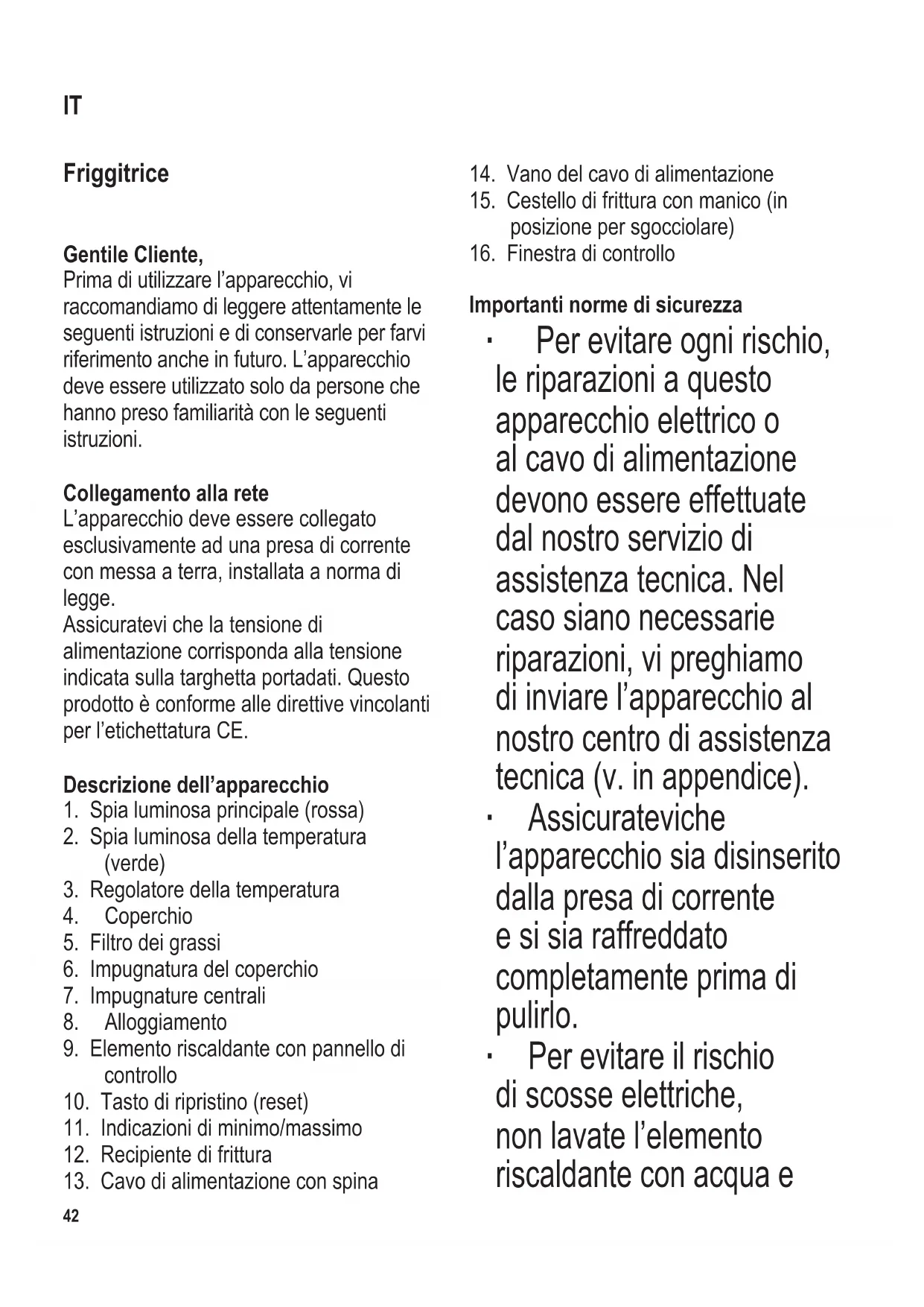 Importanti norme di sicurezza ∙ Per evitare ogni rischio, le riparazioni a questo apparecchio elettrico o al cavo di alimentazione devono essere effettuate dal nostro servizio di assistenza tecnica. Nel caso siano necessarie riparazioni, vi preghiamo di inviare l’apparecchio al nostro centro di assistenza tecnica (v. in appendice). ∙ Assicuratevi che l’apparecchio sia disinserito dalla presa di corrente e si sia raffreddato completamente prima di pulirlo. ∙ Per evitare il rischio di scosse elettriche, non lavate l’elemento riscaldante con acqua e IT104 x 142 mm