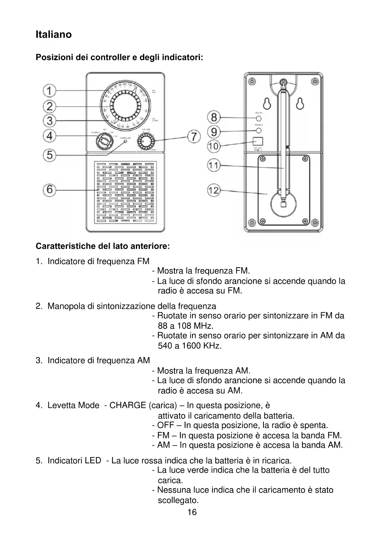 - Nota: la ricezione radio può diventare debole e il suono essere distorto quando le batterie devono essere ricaricate.