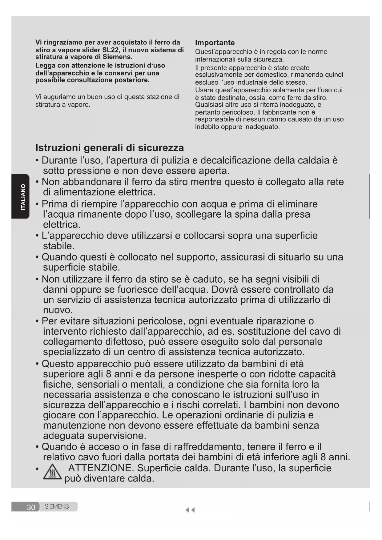 S I E M E N S ITALIANO Vi ringraziamo per aver acquistato il ferro da