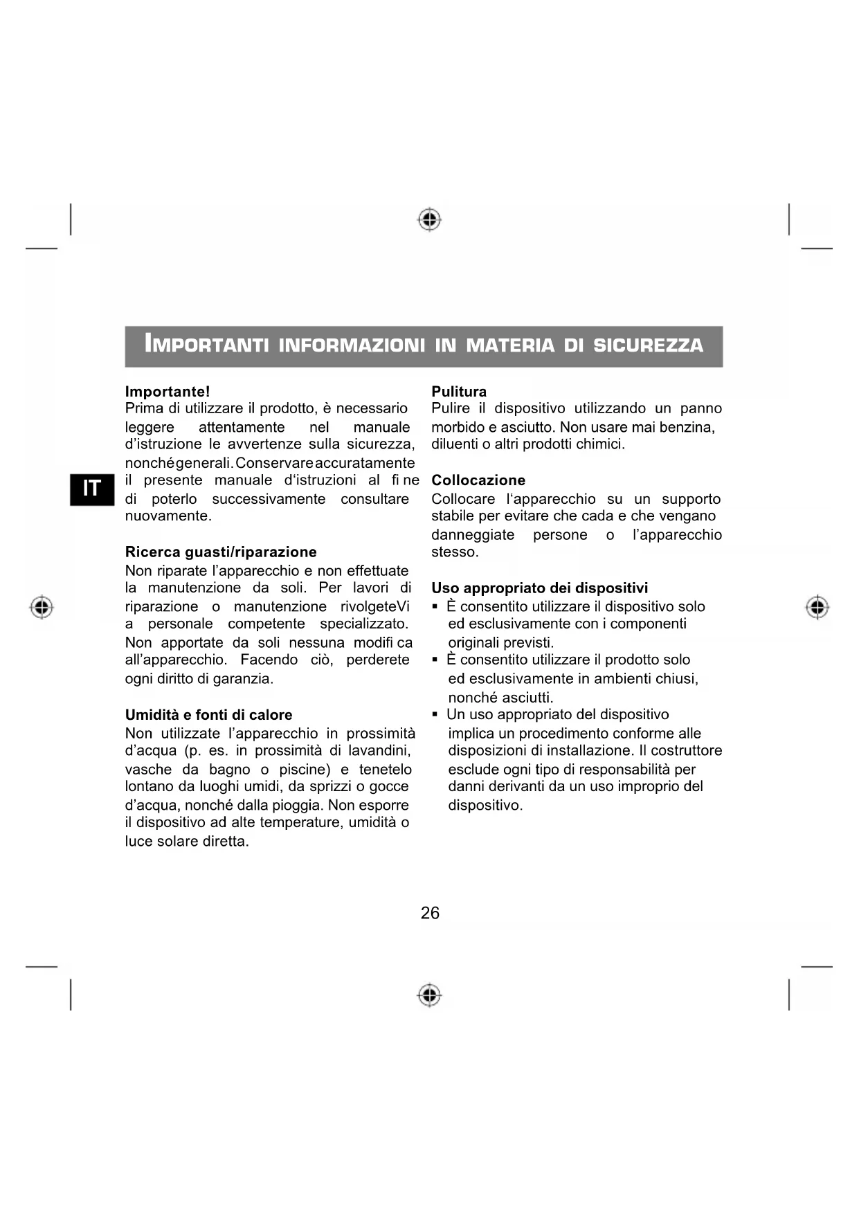 Importante! Prima di utilizzare il prodotto, è necessario leggere attentamente nel manuale d’istruzione le avvertenze sulla sicurezza, nonché generali. Conservare accuratamente il presente manuale d‘istruzioni al fi ne di poterlo successivamente consultare nuovamente. Ricerca guasti/riparazione Non riparate l’apparecchio e non effettuate la manutenzione da soli. Per lavori di riparazione o manutenzione rivolgeteVi a personale competente specializzato. Non apportate da soli nessuna modifi ca all’apparecchio. Facendo ciò, perderete ogni diritto di garanzia. Umidità e fonti di calore Non utilizzate l’apparecchio in prossimità d’acqua (p. es. in prossimità di lavandini, vasche da bagno o piscine) e tenetelo lontano da luoghi umidi, da sprizzi o gocce d’acqua, nonché dalla pioggia. Non esporre il dispositivo ad alte temperature, umidità o luce solare diretta. Pulitura Pulire il dispositivo utilizzando un panno morbido e asciutto. Non usare mai benzina, diluenti o altri prodotti chimici. Collocazione Collocare l‘apparecchio su un supporto stabile per evitare che cada e che vengano danneggiate persone o l’apparecchio stesso. Uso appropriato dei dispositivi È consentito utilizzare il dispositivo solo ed esclusivamente con i componenti originali previsti. È consentito utilizzare il prodotto solo ed esclusivamente in ambienti chiusi, nonché asciutti. Un uso appropriato del dispositivo implica un procedimento conforme alle disposizioni di installazione. Il costruttore esclude ogni tipo di responsabilità per danni derivanti da un uso improprio del dispositivo.IT
