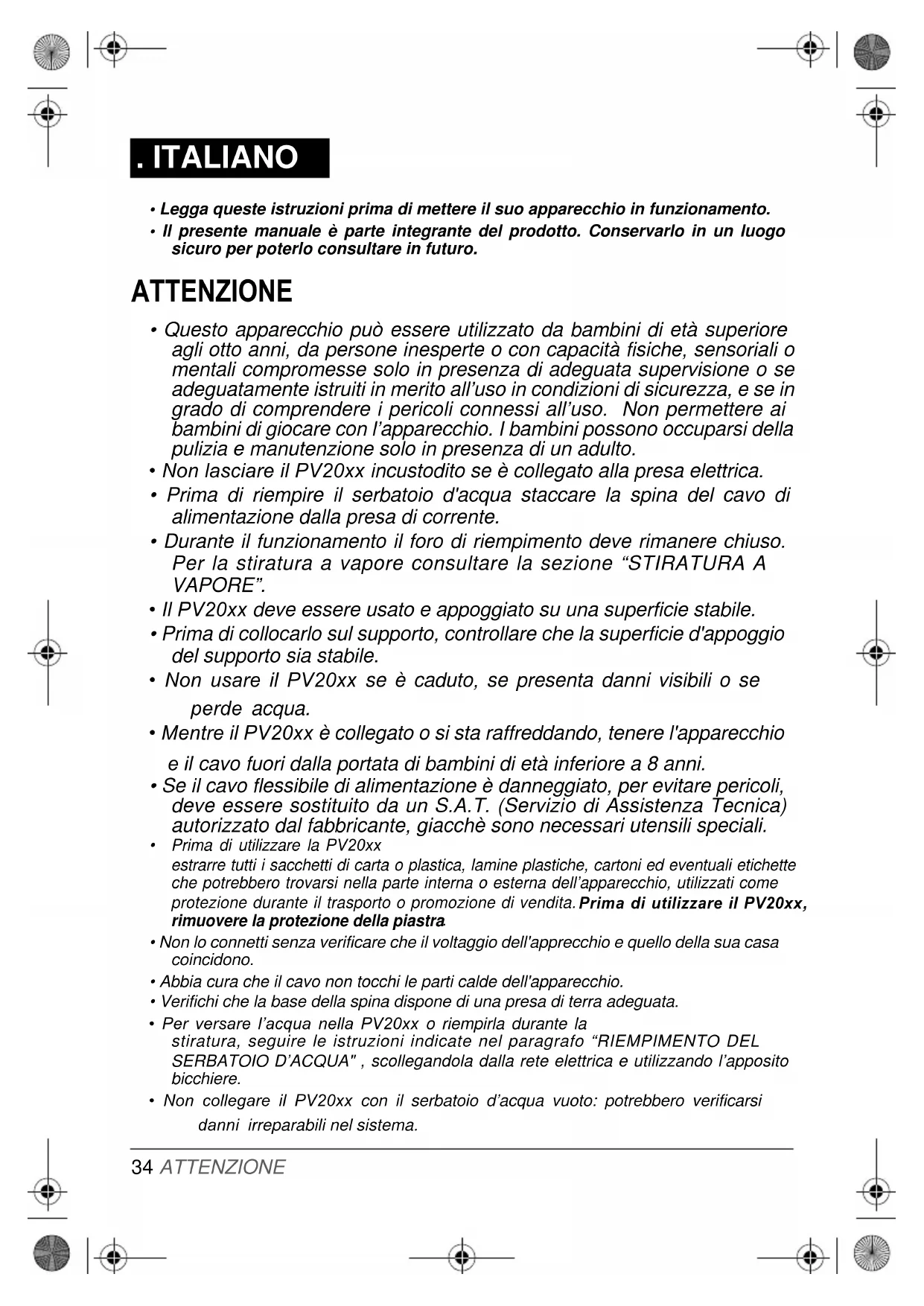 - Mentre il PV20xx è collegato o si sta raffreddando, tenere l'apparecchio e il cavo fuori dalla portata di bambini di età inferiore a 8 anni.
