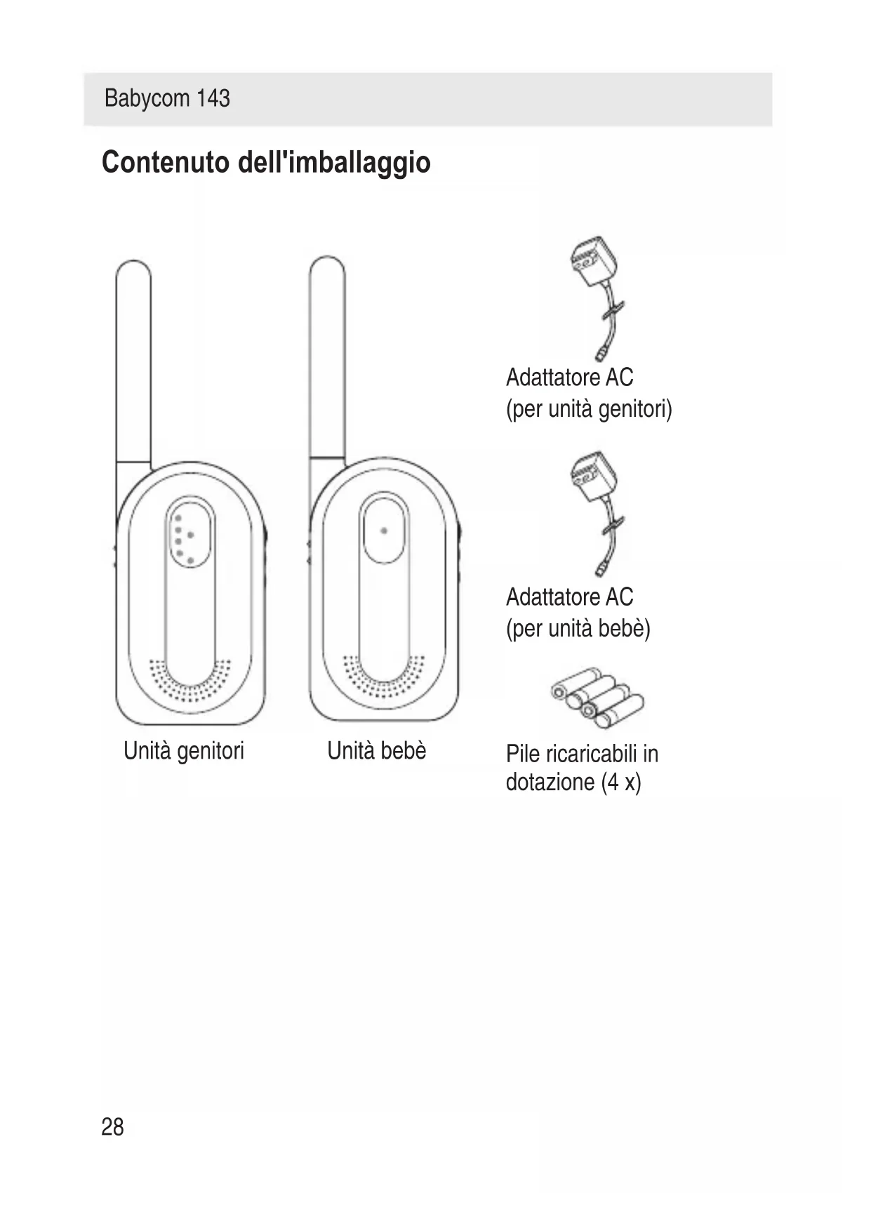Adattatore AC (per unità genitori) Adattatore AC (per unità bebè) Pile ricaricabili in dotazione (4 x) Unità genitori Unità bebèTasti e commutatori Unità bebè Unità genitori Babycom 143