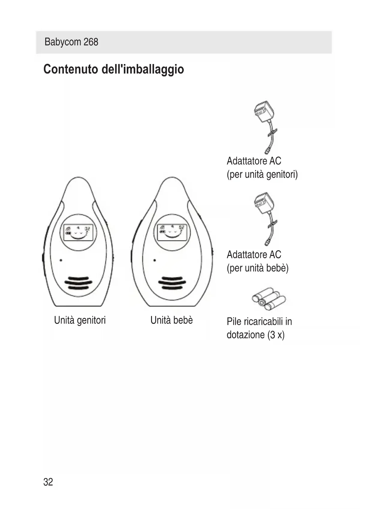 Adattatore AC (per unità genitori) Adattatore AC (per unità bebè) Pile ricaricabili in dotazione (3 x) Unità genitori Unità bebè Contenuto dell'imballaggio Babycom 268 IT_090909:Babycom 143 09.09.09 13:33 Seite 32Babycom 268