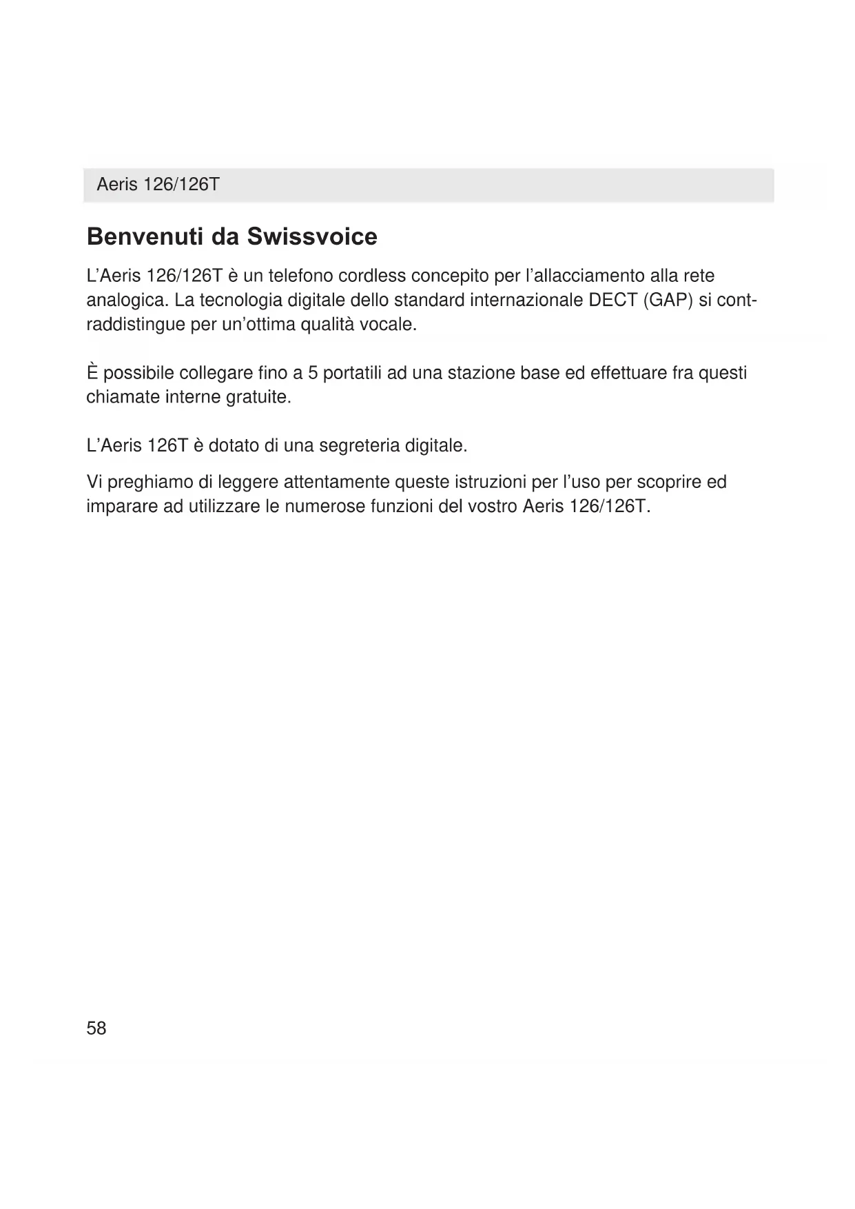 Avvertenze per lo smaltimento (Salvaguardia dell’ambiente) Alla fine del ciclo di vita, il prodotto non deve essere smaltito insieme ai rifiuti domestici. Portarlo ad un centro di raccolta specializzato nello smaltimento di apparecchi elettrici ed elettronici. Ciò è indicato dal simbolo sul prodotto, nelle istruzioni per l’uso e/o sull’imballaggio. Alcuni dei materiali di questo prodotto possono essere riciclati se il prodotto viene portato ad un centro di raccolta specializzato. Con il riciclaggio di alcune parti o materie prime dei prodotti usati si apporta un importante contributo alla salvaguardia dell’ambiente. Rivolgersi alle proprie autorità locali per ottenere maggiori informazioni sui centri di raccolta presenti nelle vostre vicinanze. Smaltimento di batterie ed accumulatori Per tutte le batterie e gli accumulatori scarichi vige l’obbligo di restituzione per legge; questi non possono essere smaltiti insieme ai rifiuti domestici. Si prega di smaltire batterie/accumulatori nel rispetto delle norme delle autorità. Portarli ai centri di rici- claggio. Batterie/accumulatori vengono riciclati poiché possono contenere ad es. nic- kel - cadmio (Ni - Cd), piombo (Pb), cadmio (Cd) o mercurio (Hg). Su batterie e accumulatori sono indicati i rispettivi simboli e le sostanze contenute, ad es.:85 Aeris 126/126T Garanzia Il vostro apparecchio è coperto da garanzia a partire dalla data d’acquisto, nei limiti delle disposizioni legali vigenti nel paese in cui è stato acquistato l’apparecchio. Quale dimostrazione della data d’acquisto vi preghiamo di conservare la prova d’ac- quisto oppure il foglio di garanzia dovutamente compilato da parte del venditore. Nel periodo di garanzia, vengono eliminati gratuitamente tutti i guasti che derivano da difetti di materiale o di fabbricazione. La prestazione di garanzia avviene tramite riparazione o sostituzione dell’apparecchio guasto, su decisione del fornitore. Non sono coperti dalla garanzia il materiale di consumo (ad esempio l’accumula- tore), difetti che riducono in modo irrilevante il valore o l’uso dell’apparecchio, non- ché guasti che derivano da uso improprio, usura o interventi effettuati da terzi. Sono esclusi da questa garanzia eventuali danni conseguenti dovuti all’uso dell’apparec- chio, guasto o difetto del prodotto, in particolare viene esclusa ogni responsabilità per danni patrimoniali. In caso di guasto coperto da garanzia vi preghiamo di rivolgervi al punto vendita presso il quale avete acquistato il telefono. Omologazione e conformità Questo apparecchio telefonico analogico DECT è conforme ai requisiti fondamentali della Direttiva R&TTE 1999/5/EG riguardante le apparecchiature radio e le apparec- chiature terminali di telecomunicazione ed è previsto per il collegamento e il funzio- namento nel paese dove è stato commercialisato. La dichiarazione di conformità può essere consultata al sito www.swissvoice.net. La conformità con la direttiva sopra menzionata è confermata dal marchio CE sull’apparecchio.86 Welcome to Swissvoice The Aeris 126/126T is a cordless telephone designed for connection to an analog telephone network. International DECT (GAP)-standard digital technology offers excellent voice quality. You can register up to 5 handsets to your base and make internal calls free of charge. The Aeris 126T comes with a built-in digital answer machine. Please read these operating instructions carefully to familiarise yourself with and take full advantage of the benefits of your new Aeris 126/126T. Aeris 126/126TSwissvoice Your Aeris 126/126T is fitted with the latest innovations in terms of reduction of electromagnetic radiation (so called “electro-smog”) as well as electrical power consumption reduction. The Swissvoice includes three main features: Multi Handset Low Radiation Mode (ECO Mode) When in standby, the electromagnetic radiation is automatically shut down between the base station and the handset(s). This works with one ore more handsets declared to the base station. The handset(s) and the base station are waiting for a wake-up signal should a call come in, when you activate one handset or when the system synchronises some data. In other terms, electromagnetic radiation is generated only when the system is in use! Radiation reduction in communication 65% radiation reduction of the handset is achieved when it is near the base station. The handset’s power transmission are regulated; the power transmitted from the handset is automatically reduced to the lower level, depending on the distance to the base station. Electrical consumption reduction The efficiency of the switching power supply reduces the electrical consumption of the telephone. Combined with the Radiation Reduction and Multi Handset Low Radiation Mode it contributes to save energy and costs.