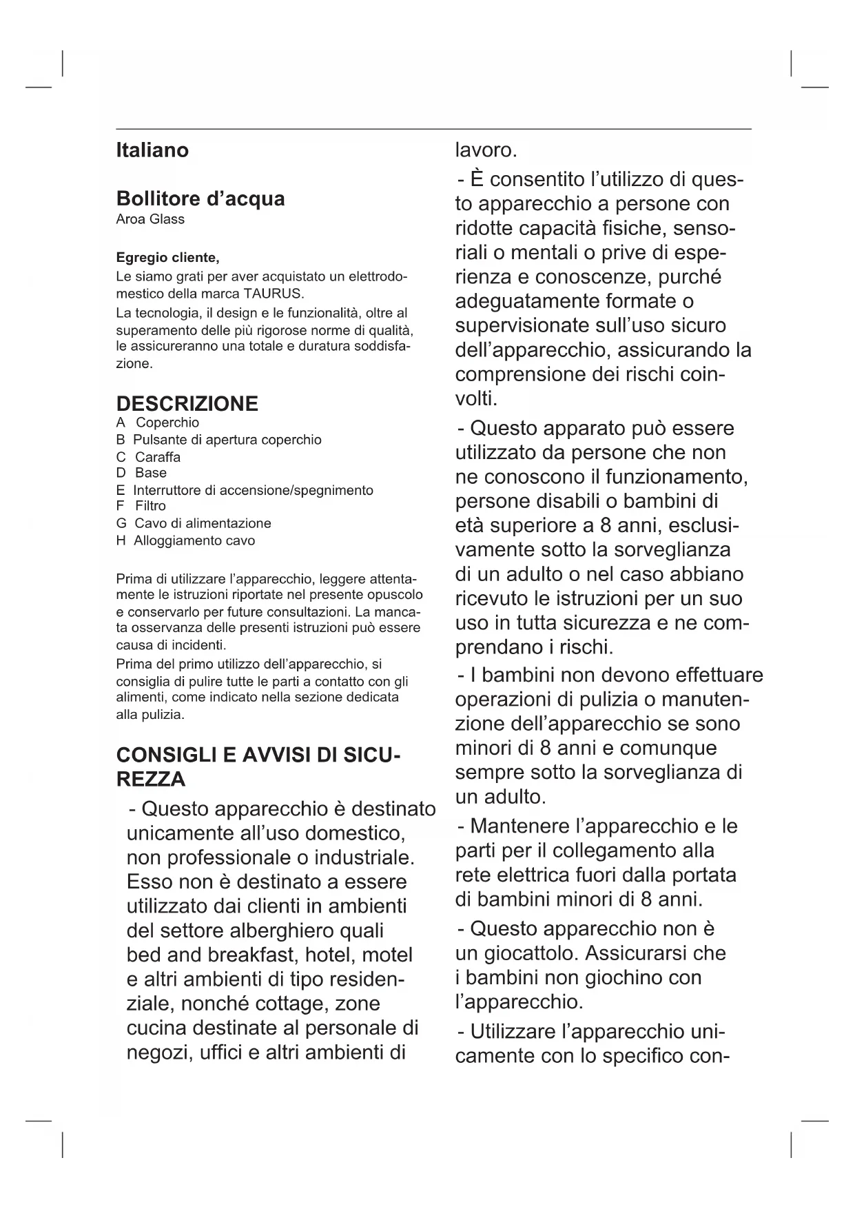 Scarica le istruzioni per il tuo Bollitore in formato PDF gratuitamente! Trova il tuo manuale Aroa - TAURUS e riprendi in mano il tuo dispositivo elettronico. In questa pagina sono pubblicati tutti i documenti necessari per l'utilizzo del tuo dispositivo. Aroa del marchio TAURUS.