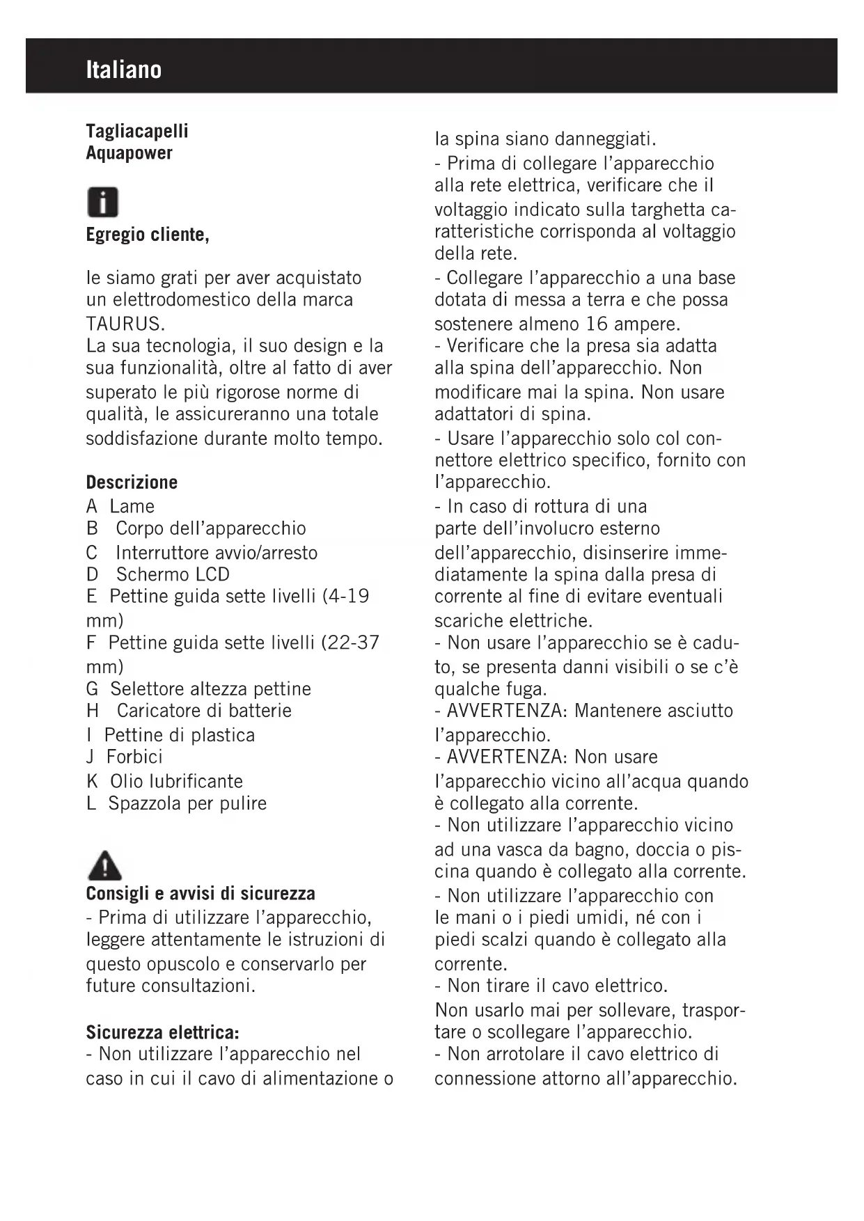Scarica le istruzioni per il tuo Rifinitore per barba in formato PDF gratuitamente! Trova il tuo manuale Aquapower - TAURUS e riprendi in mano il tuo dispositivo elettronico. In questa pagina sono pubblicati tutti i documenti necessari per l'utilizzo del tuo dispositivo. Aquapower del marchio TAURUS.