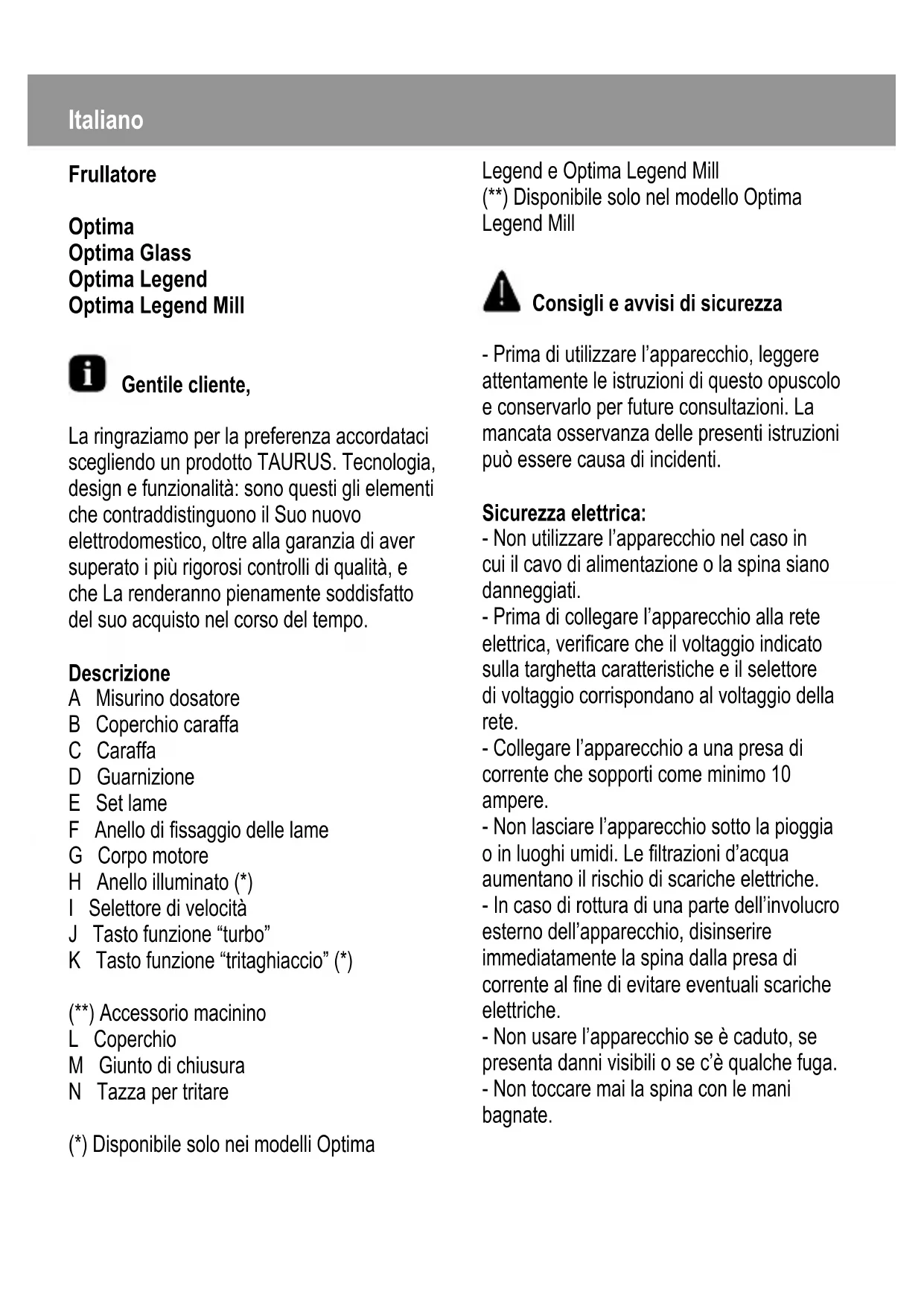 Optima Legend - Frullatore TAURUS - Manuale utente e istruzioni gratuiti
