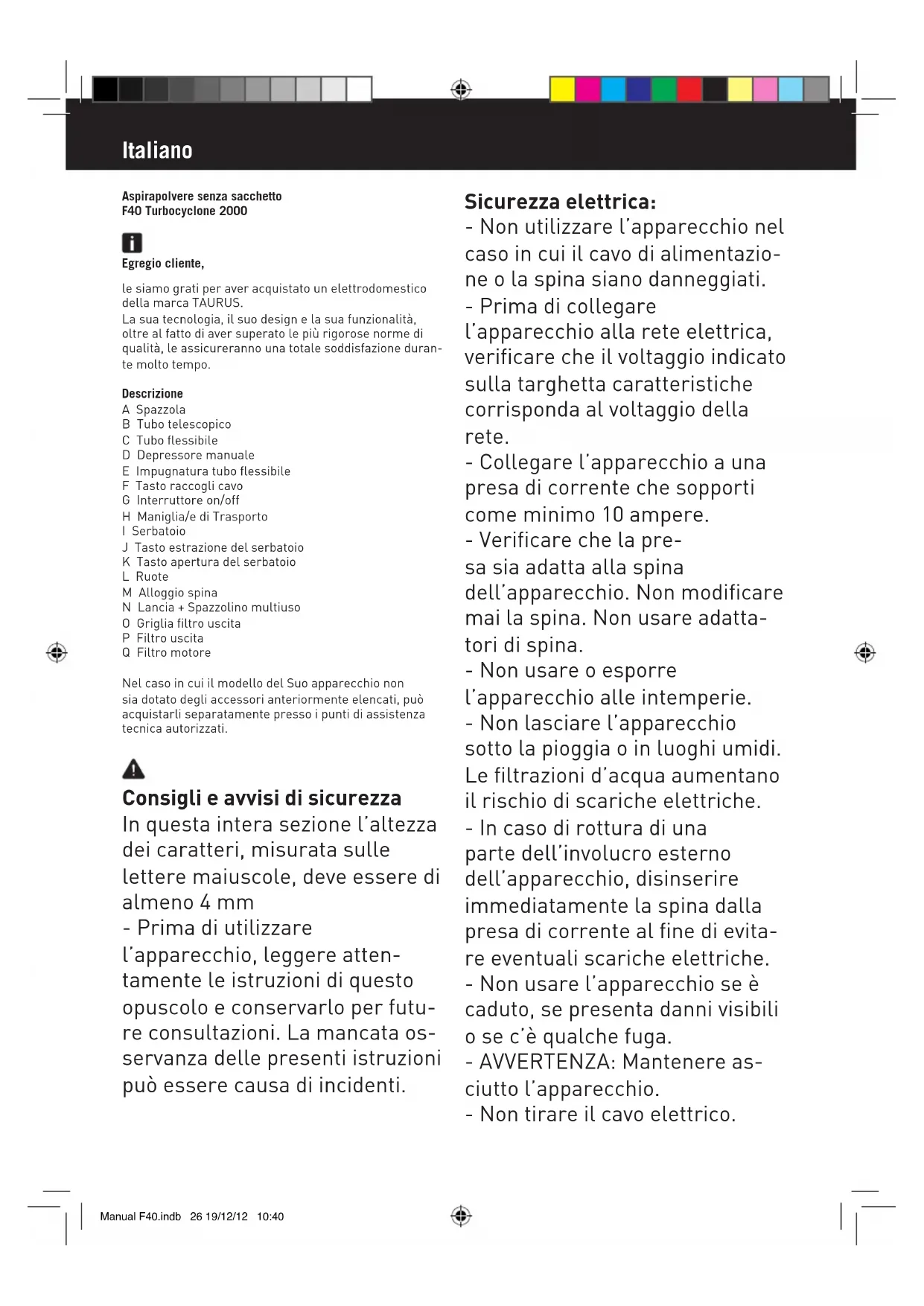 Scarica le istruzioni per il tuo Aspirapolvere in formato PDF gratuitamente! Trova il tuo manuale F40 Turbocyclone 2000 - TAURUS e riprendi in mano il tuo dispositivo elettronico. In questa pagina sono pubblicati tutti i documenti necessari per l'utilizzo del tuo dispositivo. F40 Turbocyclone 2000 del marchio TAURUS.