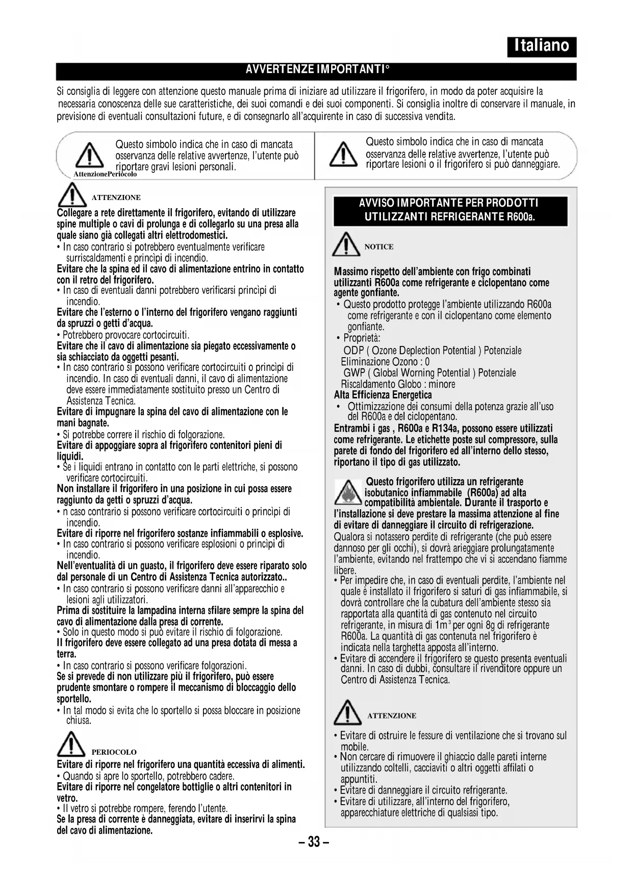 Attenzione PeriocoloNOTICEATTENZIONEPERIOCOLOATTENZIONE AVVISO IMPORTANTE PER PRODOTTI UTILIZZANTI REFRIGERANTE R600a.