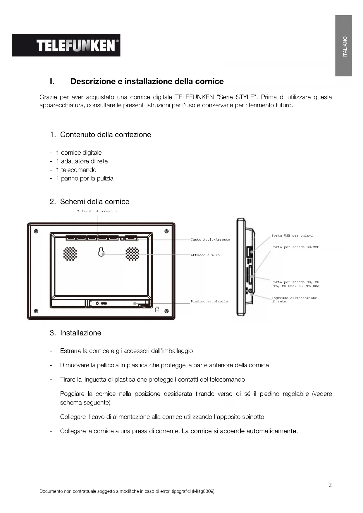 Grazie per aver acquistato una cornice digitale TELEFUNKEN "Serie STYLE". Prima di utilizzare questa apparecchiatura, consultare le presenti istruzioni per l'uso e conservarle per riferimento futuro.