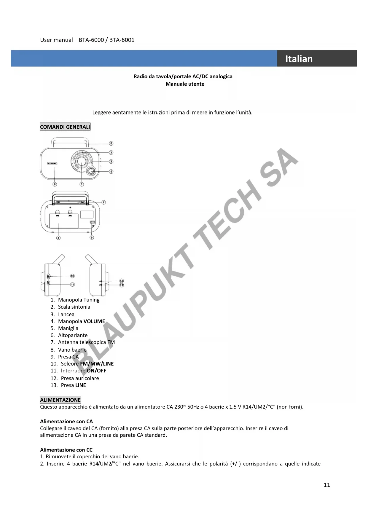 13. Presa LINE ALIMENTAZIONE Questo apparecchio è alimentato da un alimentatore CA 230~ 50Hz o 4 batterie x 1.5 V R14/UM2/"C" (non forniti).