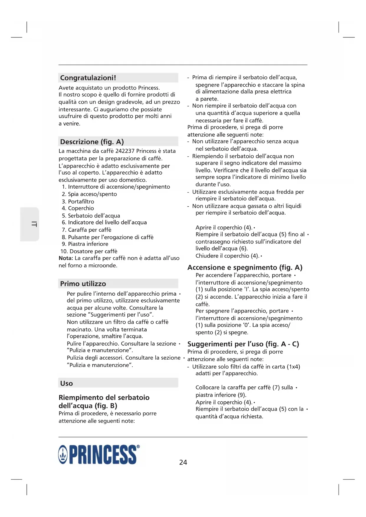 Congratulazioni! Avete acquistato un prodotto Princess. Il nostro scopo è quello di fornire prodotti di qualità con un design gradevole, ad un prezzo interessante. Ci auguriamo che possiate usufruire di questo prodotto per molti anni a venire. Descrizione (fig. A) La macchina da caffè 242237 Princess è stata progettata per la preparazione di caffè. L’apparecchio è adatto esclusivamente per l’uso al coperto. L’apparecchio è adatto esclusivamente per uso domestico.