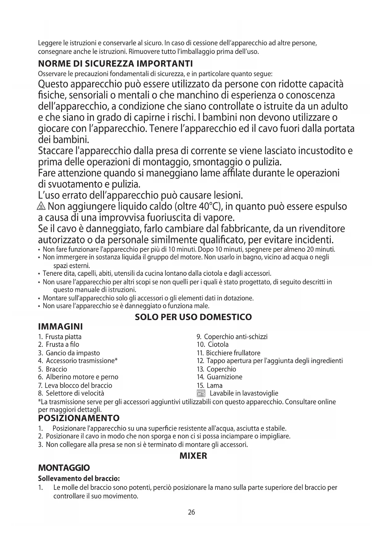 • Tenere dita, capelli, abiti, utensili da cucina lontano dalla ciotola e dagli accessori.