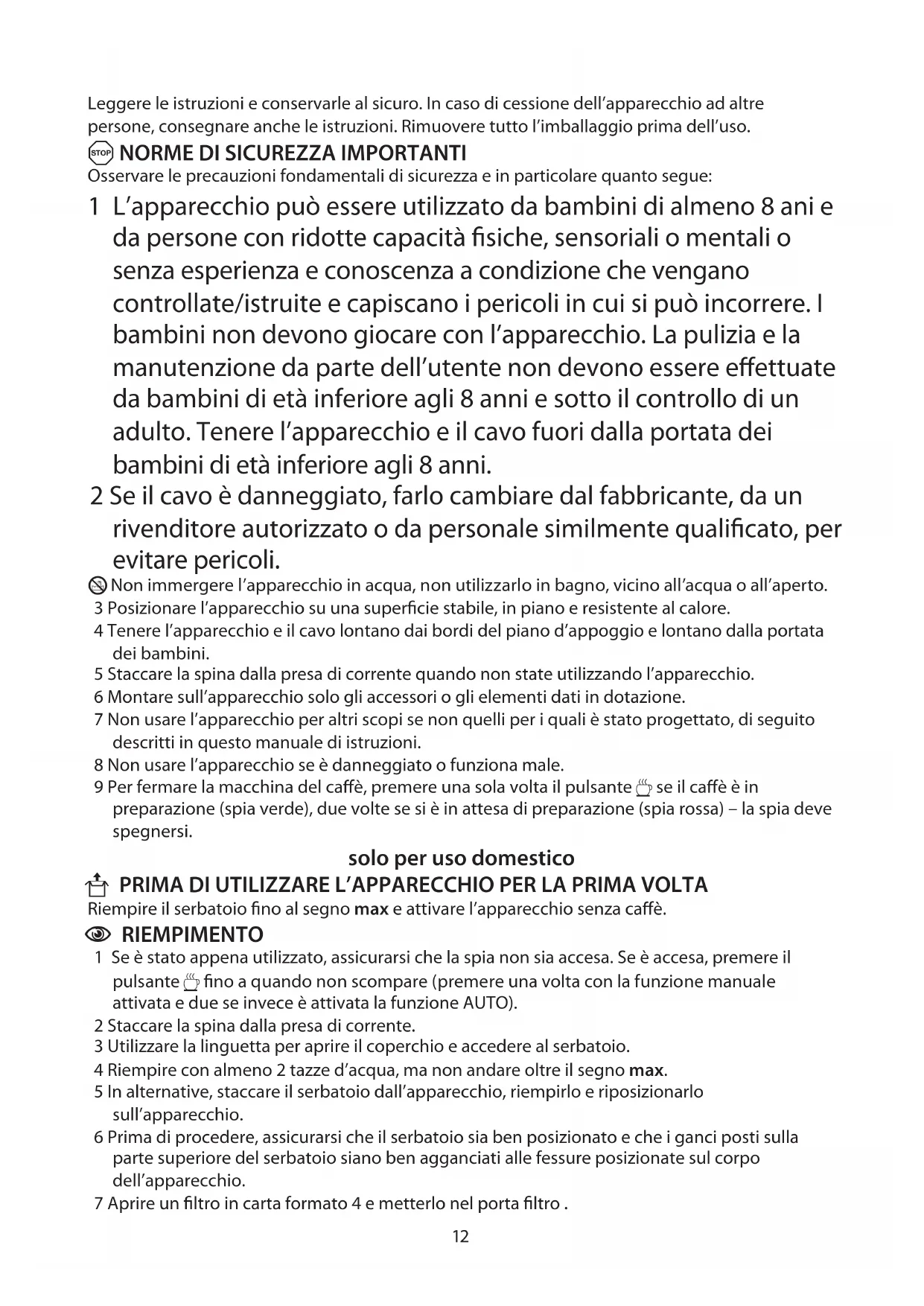 U PRIMA DI UTILIZZARE L’APPARECCHIO PER LA PRIMA VOLTA Riempire il serbatoio fino al segno max e attivare l’apparecchio senza caffè.