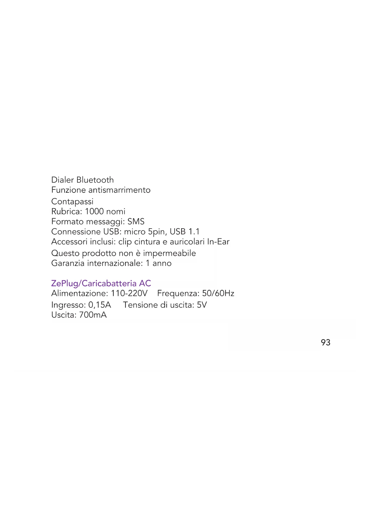Presa auricolari 3.5mm Foro per attacco On/off Attiva/Standby Presa micro USB per ricarica Tasto Volume Microfono Speaker Tasto Reset91 Icona Signicato Indicatore carica batteria Nuovo messaggio Sveglia attivata Vibrazione Bluetooth Auricolari92