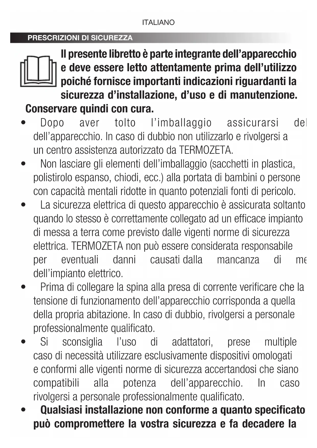 - Lo smaltimento abusivo del prodotto da parte dell’utente comporta l’applicazione delle sanzioni ammini- strative previste della normativa vigente. Termozeta S.p.A. si riserva il diritto di apportare modiche estetiche e/o tecniche senza preavviso al ne di migliorare i propri prodotti. Termozeta is an international trademark. Copyright © 1995. All rights reserved. Termozeta S.p.A. - Via Magenta, 41/43 - 20010 Bareggio (MI) Italy ITALIANOSAFETY PRESCRIPTIONS The present manual is an integral part of the appliance and must be carefully read before using it as it gives important indications with regard to safety of installation, use and maintenance. Keep it with care.