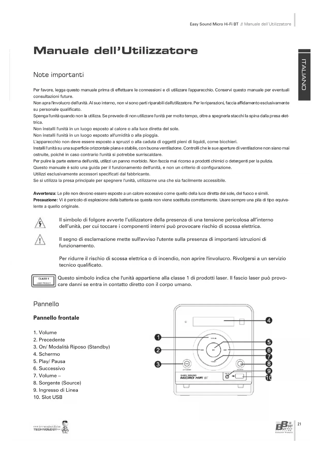 - GENERALE: In nessun caso Best Buy Internacional o suoi rappresentanti saranno responsabili di quei danni (compresi quelli de- rivanti da perdite di introiti o qualsiasi altra perdita pecuniaria), che abbiano origine in conseguenza dell'uso o dell'impossibilità di uso del prodotto in questione, anche nel caso che Best Buy International abbia informato di questa possibilità. Come godere dei vantaggi di utente registrato? Regístrarsi nel nostro sito Web http://www.bestbuy-int.com Come richiedere assistenza tecnica? Una volta effettuata la registrazione, potrà richiedere assistenza tecnica nei modi seguenti: I TA L I A N O Manuale dell’Utilizzatore // Easy Sound Micro Hi-Fi BT