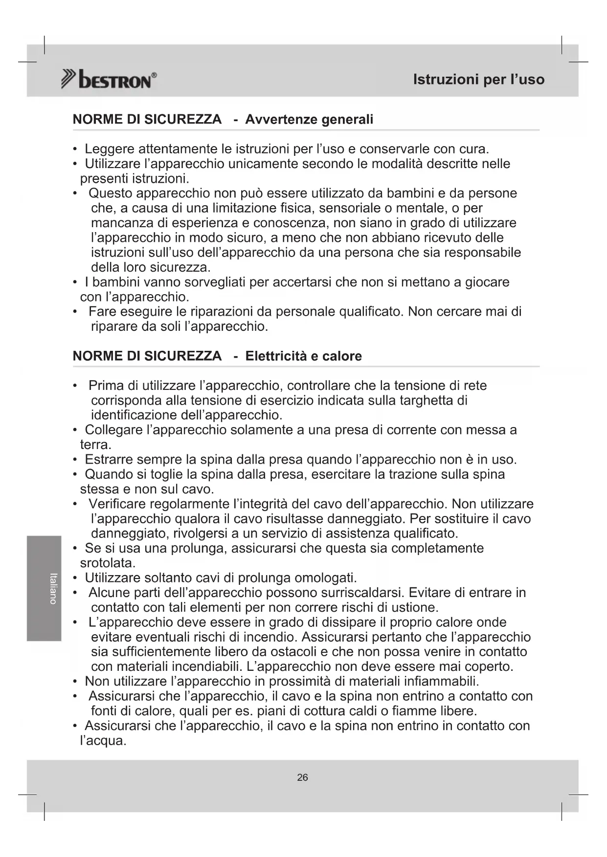 SERVIZIO Qualora dovesse verificarsi un guasto è possibile mettersi in contatto con il servizio clienti BESTRON: PAESI BASSI: Bestron NEDERLAND BV Bestron Service Moeskampweg, 20 5222 AW ’s-Hertogenbosch Tel: +31(0) 73 - 623 11 21 Fax: +31(0) 73 - 621 23 96 E-mail: info@bestron.com Internet: www.bestron.com