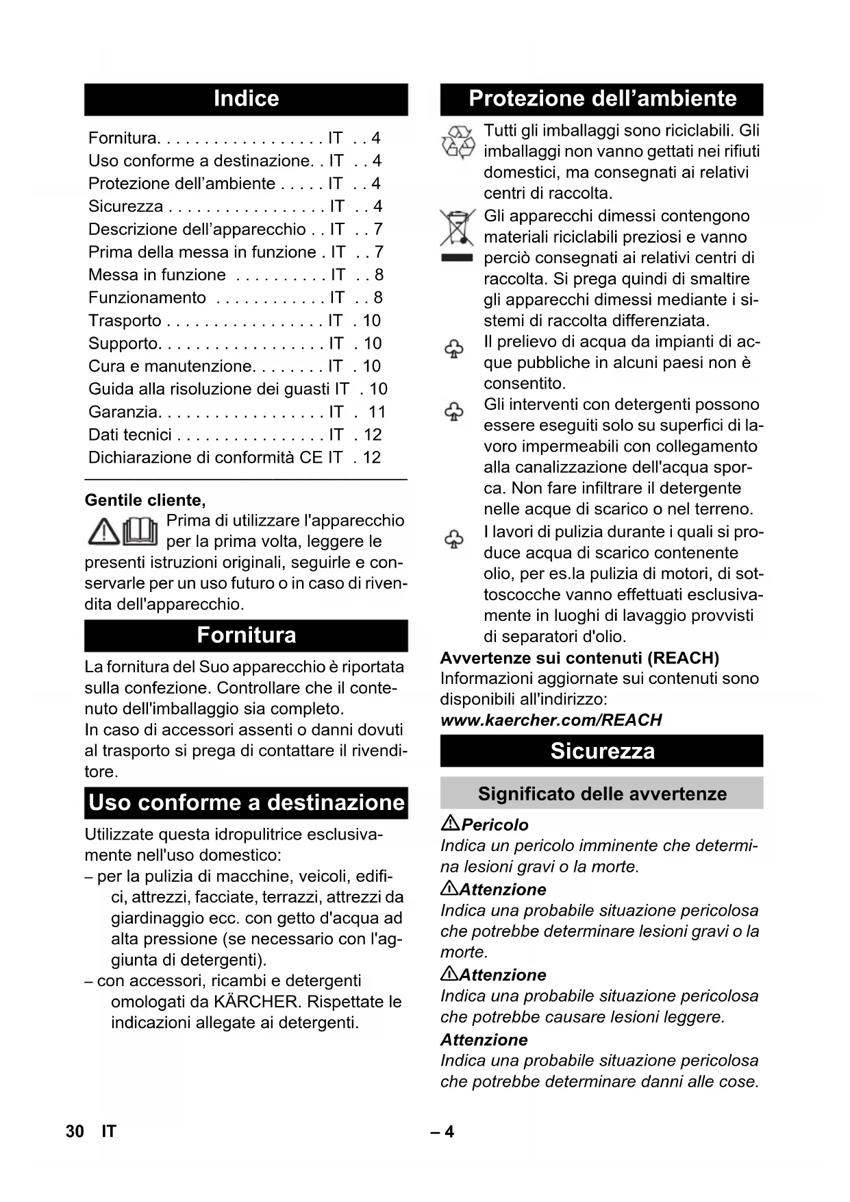 - Gentile cliente, Prima di utilizzare l'apparecchio per la prima volta, leggere le presenti istruzioni originali, seguirle e con- servarle per un uso futuro o in caso di riven- dita dell'apparecchio. La fornitura del Suo apparecchio è riportata sulla confezione. Controllare che il conte- nuto dell'imballaggio sia completo. In caso di accessori assenti o danni dovuti al trasporto si prega di contattare il rivendi- tore. Utilizzate questa idropulitrice esclusiva- mente nell'uso domestico: – per la pulizia di macchine, veicoli, edifi- ci, attrezzi, facciate, terrazzi, attrezzi da giardinaggio ecc. con getto d'acqua ad alta pressione (se necessario con l'ag- giunta di detergenti). – con accessori, ricambi e detergenti omologati da KÄRCHER. Rispettate le indicazioni allegate ai detergenti. Tutti gli imballaggi sono riciclabili. Gli imballaggi non vanno gettati nei rifiuti domestici, ma consegnati ai relativi centri di raccolta. Gli apparecchi dimessi contengono materiali riciclabili preziosi e vanno perciò consegnati ai relativi centri di raccolta. Si prega quindi di smaltire gli apparecchi dimessi mediante i si- stemi di raccolta differenziata. Il prelievo di acqua da impianti di ac- que pubbliche in alcuni paesi non è consentito. Gli interventi con detergenti possono essere eseguiti solo su superfici di la- voro impermeabili con collegamento alla canalizzazione dell'acqua spor- ca. Non fare infiltrare il detergente nelle acque di scarico o nel terreno. I lavori di pulizia durante i quali si pro- duce acqua di scarico contenente olio, per es.la pulizia di motori, di sot- toscocche vanno effettuati esclusiva- mente in luoghi di lavaggio provvisti di separatori d'olio. Avvertenze sui contenuti (REACH) Informazioni aggiornate sui contenuti sono disponibili all'indirizzo: www.kaercher.com/REACH Pericolo Indica un pericolo imminente che determi- na lesioni gravi o la morte. 몇 Attenzione Indica una probabile situazione pericolosa che potrebbe determinare lesioni gravi o la morte. 몇 Attenzione Indica una probabile situazione pericolosa che potrebbe causare lesioni leggere. Attenzione Indica una probabile situazione pericolosa che potrebbe determinare danni alle cose. Indice Fornitura