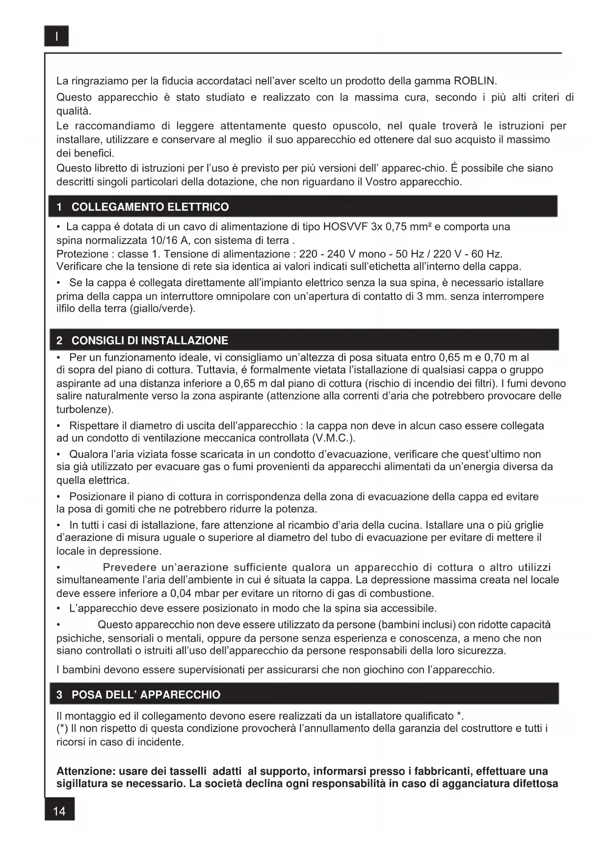 I La ringraziamo per la ducia accordataci nell’aver scelto un prodotto della gamma ROBLIN.
