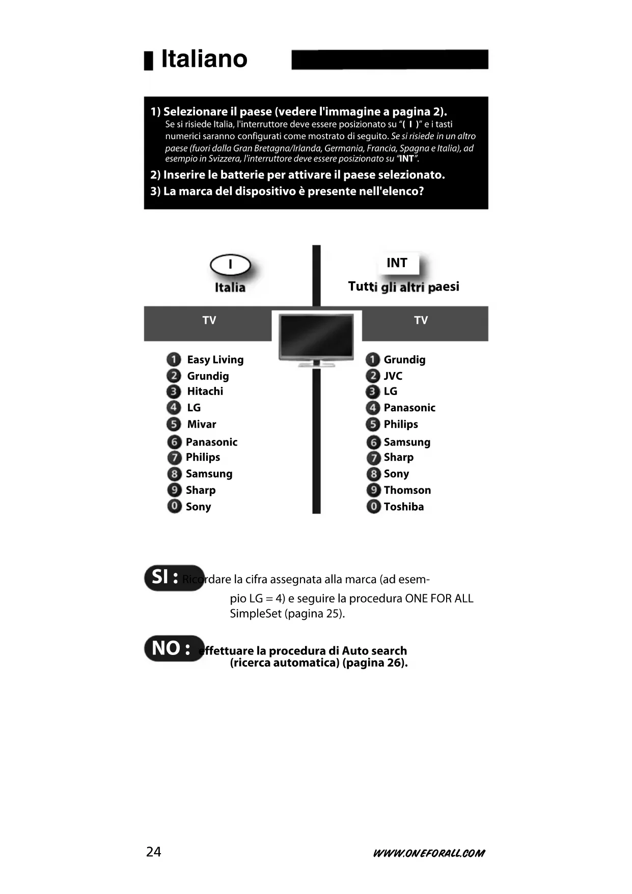 ONE FOR ALL SimpleSet È una procedura che consente di impostare in pochi minuti i dispositividelle marche più diffuse. Basta trovare il tasto numerico assegnato allamarca (pagina 24) e seguire i passaggi da A a B. .