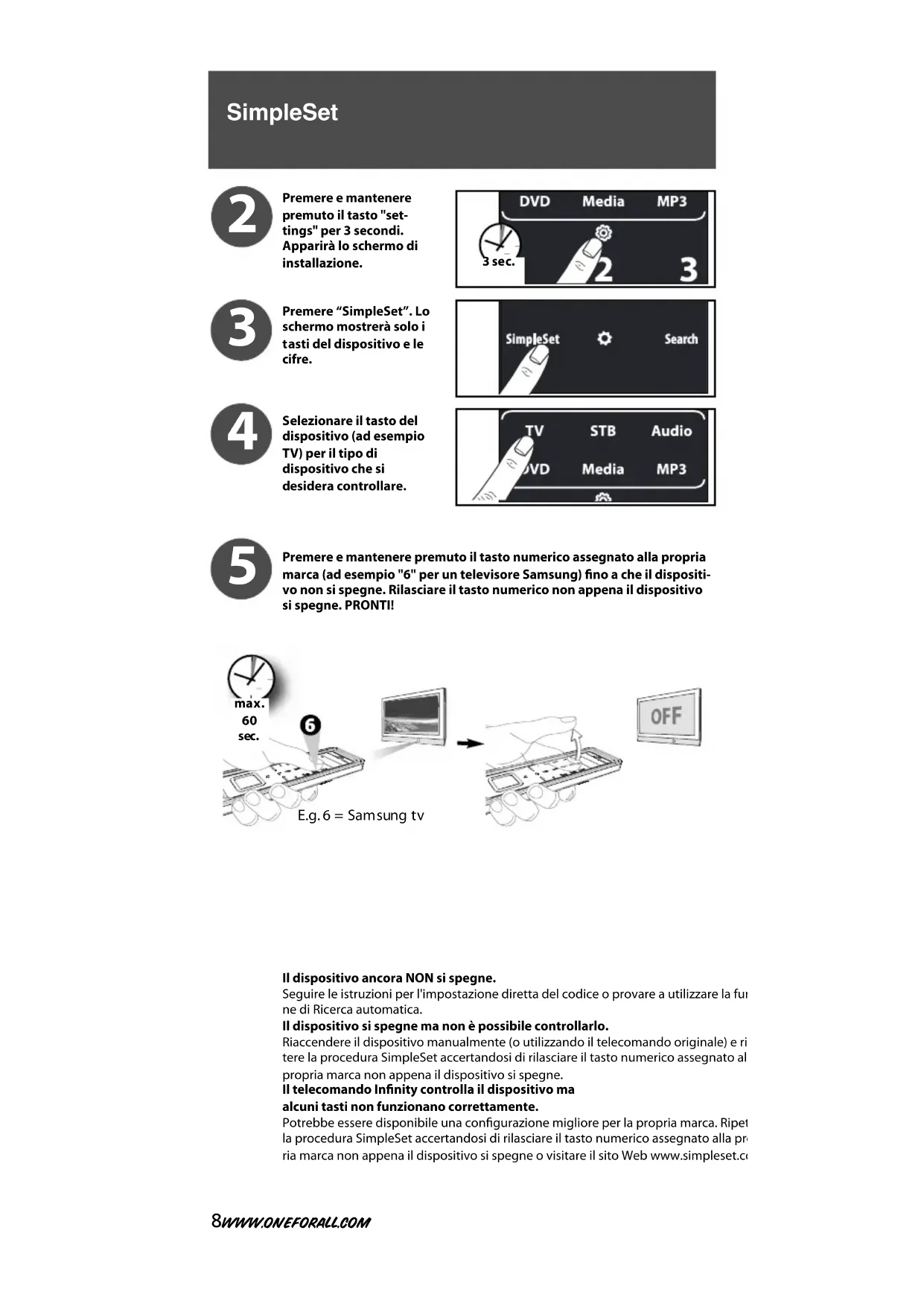 3 Premere e mantenere premuto il tasto numerico assegnato alla propriamarca (ad esempio "6" per un televisore Samsung) fino a che il dispositi-vo non si spegne. Rilasciare il tasto numerico non appena il dispositivosi spegne. PRONTI!Il dispositivo ancora NON si spegne.Seguire le istruzioni per l'impostazione diretta del codice o provare a utilizzare la funzio-ne di Ricerca automatica.Il dispositivo si spegne ma non è possibile controllarlo.Riaccendere il dispositivo manualmente (o utilizzando il telecomando originale) e ripe-tere la procedura SimpleSet accertandosi di rilasciare il tasto numerico assegnato allapropria marca non appena il dispositivo si spegne.Il telecomando Infinity controlla il dispositivo maalcuni tasti non funzionano correttamente.Potrebbe essere disponibile una configurazione migliore per la propria marca. Ripeterela procedura SimpleSet accertandosi di rilasciare il tasto numerico assegnato alla prop-ria marca non appena il dispositivo si spegne o visitare il sito Web www.simpleset.com. SimpleSet