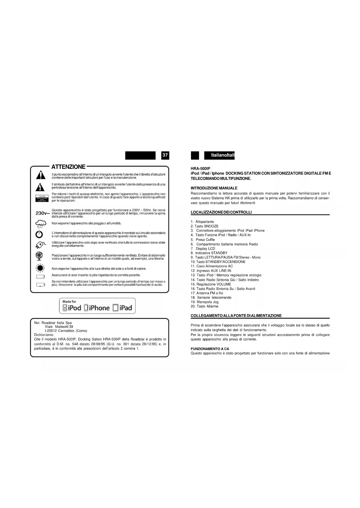 ATTENZIONE Il punto esclamativo all’interno di un triangolo avverte l’utente che il libretto d’istruzionicontiene delle importanti istruzioni per l’uso e la manutenzione.Il simbolo del fulmine all’interno di un triangolo avverte l’utente della presenza di unapericolosa tensione all’interno dell’apparecchio.Per ridurre i rischi di scosse elettriche, non aprire l’apparecchio. L’apparecchio noncontiene parti riparabili dall’utente. In caso di guasto fare appello a tecnici qualificatiper le riparazioni.Questo apparecchio è stato progettato per funzionare a 230V ~ 50Hz. Se nonsiintende utilizzare l’apparecchio per un lungo periodo di tempo, rimuovere la spinadalla presa di corrente.Non esporre l’apparecchio alla pioggia o all’umidità.L’interruttore di alimentazione di questo apparecchio è montato sul circuito secondarioe non disconnette completamente l’apparecchio quando viene spento.Utilizzare l’apparecchio solo dopo aver verificato che tutte le connessioni siano stateeseguite correttamente.Posizionare l’apparecchio in un luogo sufficientemente ventilato. Evitare di sistemarlovicino a tende, sul tappeto o all’interno di un mobile quale, ad esempio, una libreria.Non esporre l’apparecchio alla luce diretta del sole o a fonti di calore.Assicurarsi di aver inserito la pila rispettando la corretta polarità.Se non intendete utilizzare l’apparecchio per un lungo periodo di tempo (un mese opiù), rimuovere la pila dal compartimento per evitare possibili fuoriuscite di acido.CAUTIONRISK OF ELECTRICSHOCKDO NOT OPEN 230v~ Noi. Roadstar Italia Spa Viale Matteotti 39 I-22012 Cernobbio (Como) Dichiariamo: Che il modello HRA-500IP, Docking Sation HRA-500IP della Roadstar è prodotto in conformità al D.M. no. 548 datato 28/08/95 (G.U. no. 301 datata 28/12/95) e, in particolare, è in conformità alle prescrizioni dell’articolo 2 comma 1. HRA-500IP iPod / iPad / Iphone DOCKING STATION CON SINTONIZZATORE DIGITALE FM E TELECOMANDO MULTIFUNZIONE. INTRODUZIONE MANUALE Raccomandiamo la lettura accurata di questo manuale per potervi familiarizzare con il vostro nuovo Sistema Hifi prima di utilizzarlo per la prima volta. Raccomandiamo di conser- vare questo manuale per futuri riferimenti