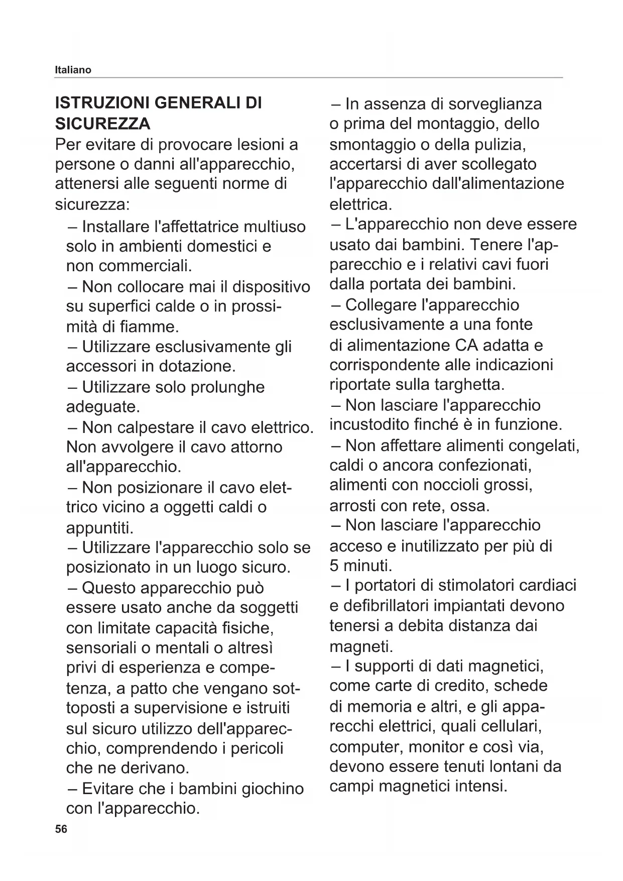 SICUREZZA Per evitare di provocare lesioni a persone o danni all'apparecchio, attenersi alle seguenti norme di sicurezza: – Installare l'aettatrice multiuso solo in ambienti domestici e non commerciali. – Non collocare mai il dispositivo su superci calde o in prossi- mità di amme. – Utilizzare esclusivamente gli accessori in dotazione. – Utilizzare solo prolunghe adeguate. – Non calpestare il cavo elettrico. Non avvolgere il cavo attorno all'apparecchio. – Non posizionare il cavo elet- trico vicino a oggetti caldi o appuntiti. – Utilizzare l'apparecchio solo se posizionato in un luogo sicuro. – Questo apparecchio può essere usato anche da soggetti con limitate capacità siche, sensoriali o mentali o altresì privi di esperienza e compe- tenza, a patto che vengano sot- toposti a supervisione e istruiti sul sicuro utilizzo dell'apparec- chio, comprendendo i pericoli che ne derivano. – Evitare che i bambini giochino con l'apparecchio. – In assenza di sorveglianza o prima del montaggio, dello smontaggio o della pulizia, accertarsi di aver scollegato l'apparecchio dall'alimentazione elettrica. – L'apparecchio non deve essere usato dai bambini. Tenere l'ap- parecchio e i relativi cavi fuori dalla portata dei bambini. – Collegare l'apparecchio esclusivamente a una fonte di alimentazione CA adatta e corrispondente alle indicazioni riportate sulla targhetta. – Non lasciare l'apparecchio incustodito nché è in funzione. – Non aettare alimenti congelati, caldi o ancora confezionati, alimenti con noccioli grossi, arrosti con rete, ossa. – Non lasciare l'apparecchio acceso e inutilizzato per più di 5 minuti. – I portatori di stimolatori cardiaci e debrillatori impiantati devono tenersi a debita distanza dai magneti. – I supporti di dati magnetici, come carte di credito, schede di memoria e altri, e gli appa- recchi elettrici, quali cellulari, computer, monitor e così via, devono essere tenuti lontani da campi magnetici intensi.57 Rischio di folgorazione – Nel caso di malfunzionamento, prima di ogni intervento di puli- zia o quando l'apparecchio non viene utilizzato, disconnetterlo dalla presa di alimentazione. Eseguire questa operazione aerrando la presa, non il cavo. – Non immergere mai l'apparecchio in acqua. Tenere l'apparecchio lontano da qualsiasi fonte di umidità. Se l'apparecchio dovesse cadere accidentalmente in acqua, staccare immediata- mente la spina, quindi estrarlo dall'acqua. Prima di riutilizzare l'apparecchio, si consiglia di farlo controllare accuratamente in uno dei centri di assistenza autorizzati. – Non utilizzare l'apparecchio con le mani umide. Evitare di utilizzare l'apparecchio quando questo è umido o quando il pavimento è bagnato. Non uti- lizzare l'apparecchio all'aperto. – In caso di danneggiamenti ai componenti dell'apparecchio, cessarne immediatamente il funzionamento e mettersi in contatto con il servizio clienti ritter. – Se il cavo elettrico viene dan- neggiato, per motivi di sicu- rezza la sostituzione deve essere eettuata dal produt- tore, dal servizio di assistenza del produttore o da personale altrettanto qualicato. Pericolo di lesioni – Utilizzare sempre il carrello o il pressasalumi, a meno che la forma o la grandezza dell'alimento da aettare non lo impediscano. – Spegnere l'apparecchio e scollegarlo dall'alimentazione elettrica prima di procedere alla sostituzione di accessori o componenti aggiuntivi che sono in movimento quando la macchina è in funzione. – La lama è molto alata. – Non toccare mai la lama men- tre l'apparecchio è in funzione. – Spegnere l'apparecchio prima di pulirlo, staccarlo dalla presa e portare la manopola di rego- lazione dello spessore del taglio sulla posizione "0". – Dopo lo spegnimento, la lama continua a girare per alcuni secondi. Italiano58 Italiano Aprire le pagine dei graci nella copertina anteriore e posteriore del libretto. Leggere attentamente le istru- zioni prima di mettere in funzione l'apparecchio. Conservare le istruzioni e, in caso di cessione dell'apparecchio, consegnarle al nuovo proprietario. Sono tuttavia sempre disponibili istruzioni d'uso aggiornate nel sito www.ritterwerk.de. UTILIZZO PREVISTO Questa aettatrice multiuso consente di aettare alimenti per uso domestico. L'aettatrice multiuso è idonea al contatto con alimenti. L'utilizzo improprio o errato può causare gravi lesioni personali o danni all'apparecchio. In questi casi la garanzia perde la validità e l'azienda declina ogni forma di responsabilità.
