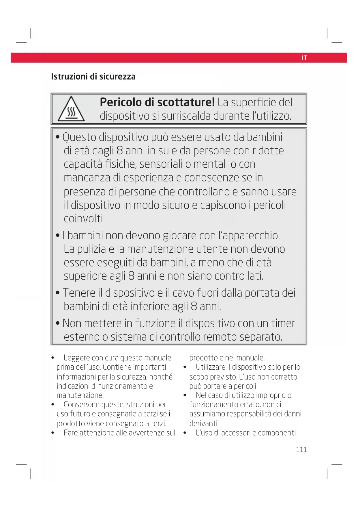 - I bambini non devono giocare con l’apparecchio. La pulizia e la manutenzione utente non devono essere eseguiti da bambini, a meno che di età superiore agli 8 anni e non siano controllati.