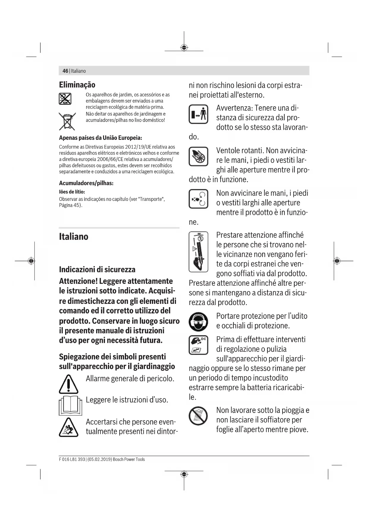 L’accessorio illustrato oppure descritto non è compreso nel volume di fornitura standard. L’accessorio completo è con- tenuto nel nostro programma accessori. Dati tecnici Soffiatore per foglie a batteria ricaricabile ALB 36 LI Codice prodotto 3 600 HA0 4.. Tensione nominale V 36 Velocità flusso d’aria km/h 250 Peso in funzione della EPTA‑Procedure 01:2014 kg 2,3/2,4/2,8/2,9 Numero di serie Vedi targhetta del tipo sull’apparecchio per il giardi- naggio Temperatura ambiente consentita – Durante la ricarica °C 0 … +45 – Durante il funzionamento e il magazzinaggio °C -20 … +40 Batteria ricaricabile Ioni di litio Tensione nominale V 36 Codice prodotto/autonomia – 2 607 336 631 Ah 1,3 – 2 607 336 913/ 1 607 A35 02V Ah 2,0 – 2 607 336 107 Ah 2,6 – 2 607 336 915/