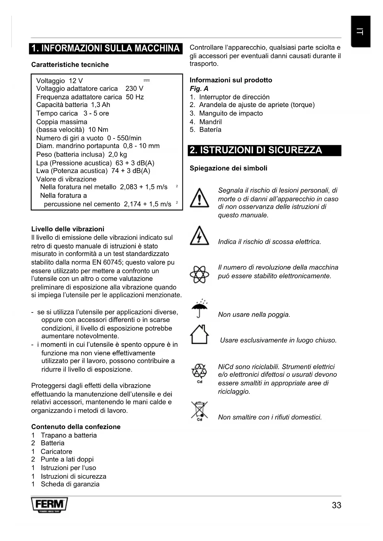 Spiegazione dei simboli DESCRIPTION (FIG. A) Segnala il rischio di lesioni personali, di morte o di danni all’apparecchio in caso di non osservanza delle istruzioni di questo manuale. Indica il rischio di scossa elettrica. Il numero di revoluzione della macchina puó essere stabilito elettronicamente. Non usare nella poggia. Usare esclusivamente in luogo chiuso. NiCd sono riciclabili. Strumenti elettrici e/o elettronici difettosi o usurati devono essere smaltiti in appropriate aree di riciclaggio. Non smaltire con i riuti domestici.34