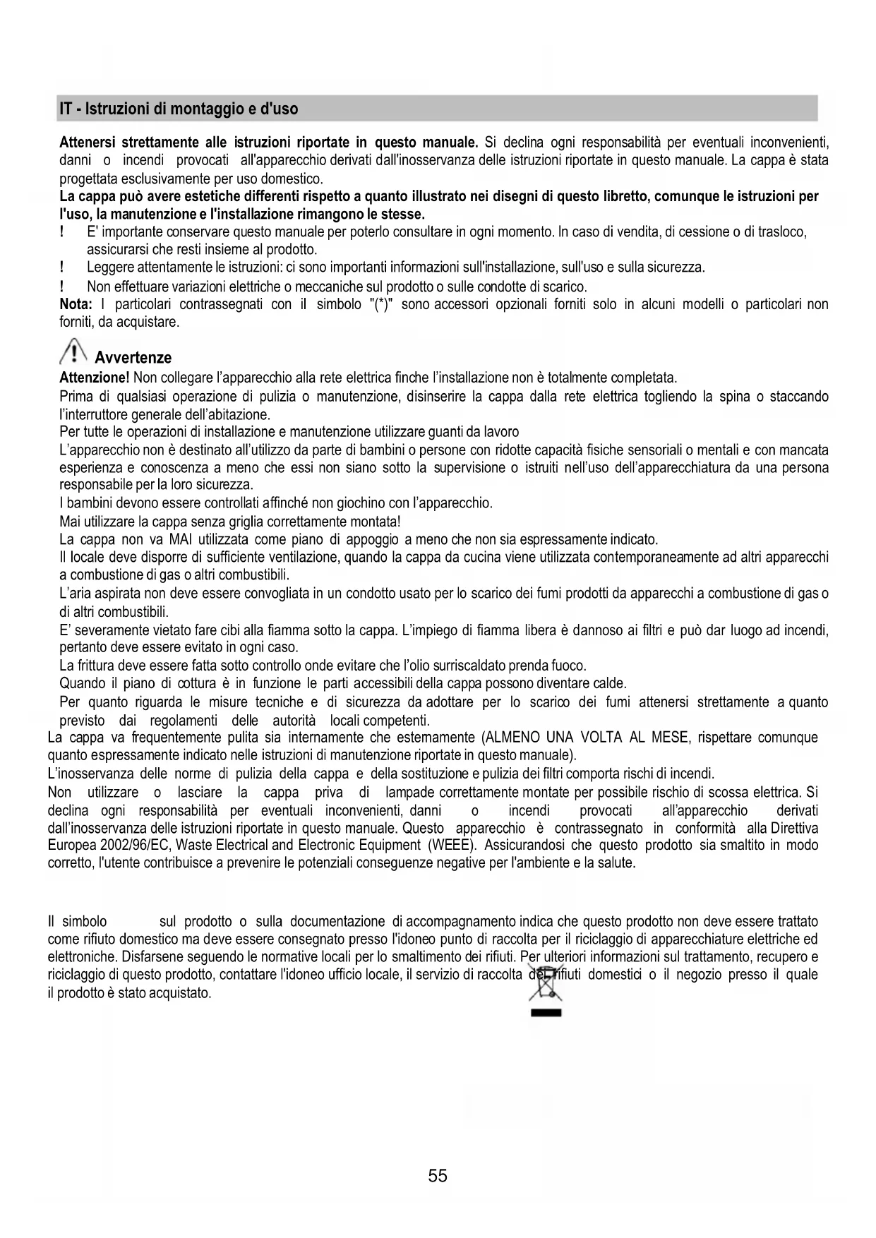 bipolare a norma che assicuri la disconnessione completa della rete nelle condizioni della categoria di sovratensione III, conformemente alle regole di installazione. Attenzione! Prima di ricollegare il circuito della cappa all’alimentazione di rete e di verificarne il corretto funzionamento, controllare sempre che il cavo di rete sia stato montato correttamente. La cappa è provvista di un cavo alimentazione speciale; in caso di danneggiamento del cavo, richiederlo al servizio assistenza tecnica.