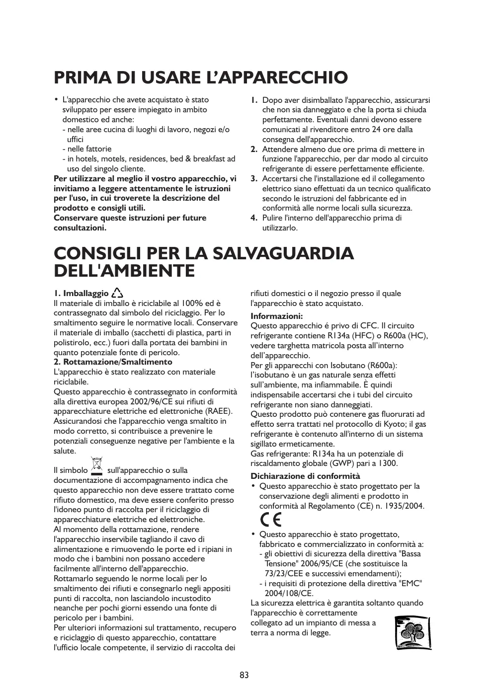 Informations : Cet appareil est sans CFC. Le circuit réfrigérant contient du R134a (HFC) ou du R600a (HC). Pour en savoir plus, consultez la plaquette signalétique située à l'intérieur de l'appareil. Pour les appareils à isobutane (R600a) : l'isobutane est un gaz naturel sans danger pour l'environnement, mais inflammable. Assurez-vous par conséquent que les tuyaux du circuit réfrigérant sont en parfait état. Ce produit peut contenir des gaz à effet de serre fluorés visés par le protocole de Kyoto ; le gaz réfrigérant est contenu à l'intérieur d'un circuit hermétique. Gaz réfrigérant : le R134a a un potentiel de réchauffement global (GWP) de 1300. Déclaration de conformité • Cet appareil est destiné à la conservation de produits alimentaires et est fabriqué conformément à la réglementation CE N° 1935/2004.