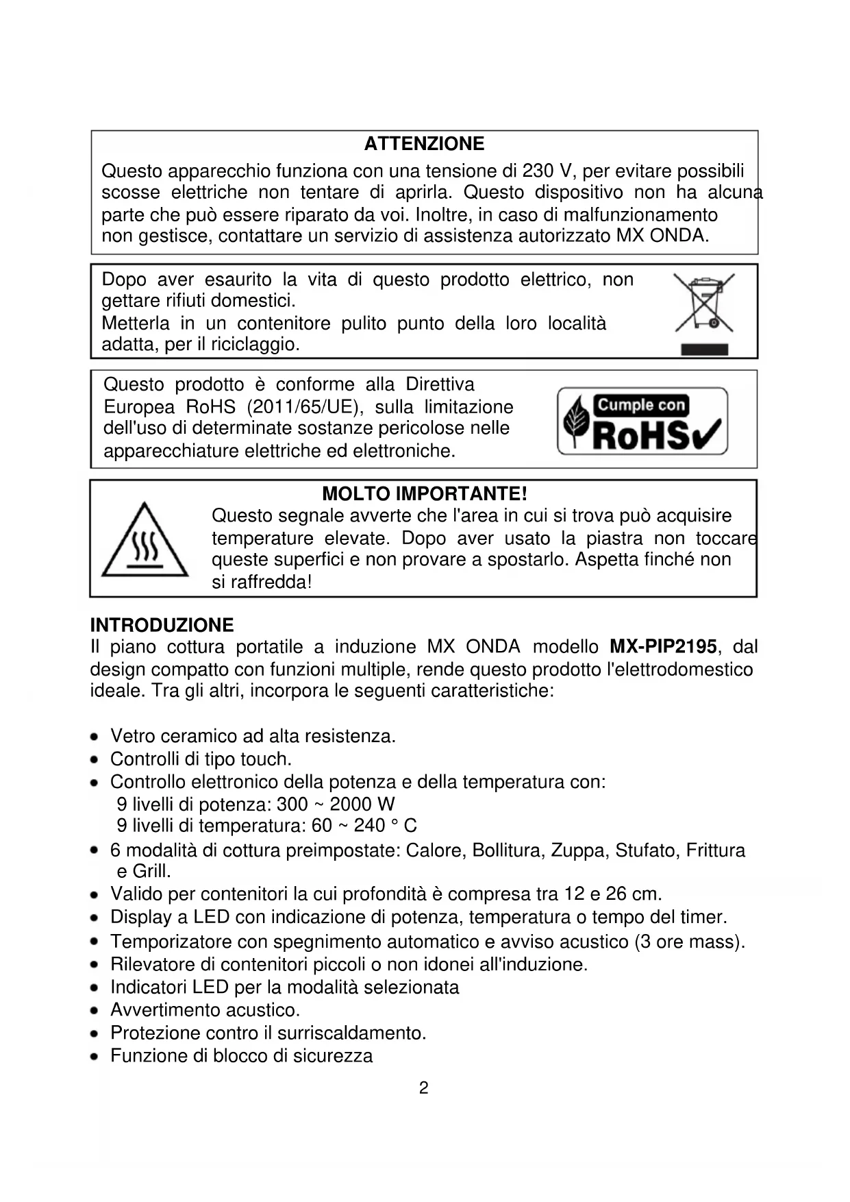 Questo prodotto è conforme alla Direttiva Europea RoHS (2011/65/UE), sulla limitazione dell'uso di determinate sostanze pericolose nelle apparecchiature elettriche ed elettroniche. MOLTO IMPORTANTE! Questo segnale avverte che l'area in cui si trova può acquisire temperature elevate. Dopo aver usato la piastra non toccare queste superfici e non provare a spostarlo. Aspetta finché non si raffredda! INTRODUZIONE Il piano cottura portatile a induzione MX ONDA modello MX-PIP2195, dal design compatto con funzioni multiple, rende questo prodotto l'elettrodomestico ideale. Tra gli altri, incorpora le seguenti caratteristiche: Vetro ceramico ad alta resistenza. Controlli di tipo touch. Controllo elettronico della potenza e della temperatura con: 9 livelli di potenza: 300 ~ 2000 W 9 livelli di temperatura: 60 ~ 240 ° C 6 modalità di cottura preimpostate: Calore, Bollitura, Zuppa, Stufato, Frittura e Grill. Valido per contenitori la cui profondità è compresa tra 12 e 26 cm. Display a LED con indicazione di potenza, temperatura o tempo del timer. Temporizatore con spegnimento automatico e avviso acustico (3 ore mass). Rilevatore di contenitori piccoli o non idonei all'induzione. Indicatori LED per la modalità selezionata Avvertimento acustico. Protezione contro il surriscaldamento. Funzione di blocco di sicurezza