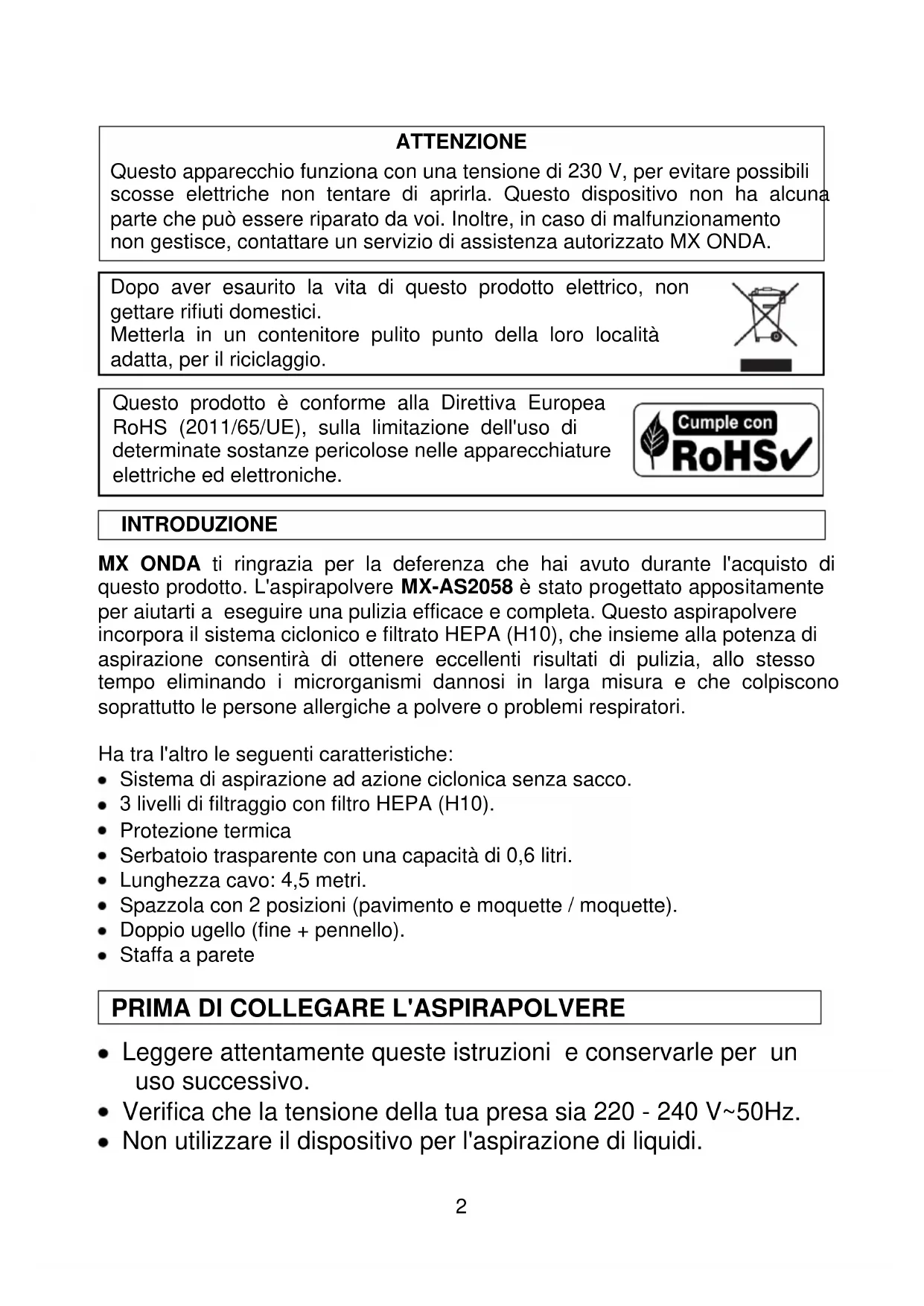 Questo prodotto è conforme alla Direttiva Europea RoHS (2011/65/UE), sulla limitazione dell'uso di determinate sostanze pericolose nelle apparecchiature elettriche ed elettroniche. INTRODUZIONE MX ONDA ti ringrazia per la deferenza che hai avuto durante l'acquisto di questo prodotto. L'aspirapolvere MX-AS2058 è stato progettato appositamente per aiutarti a eseguire una pulizia efficace e completa. Questo aspirapolvere incorpora il sistema ciclonico e filtrato HEPA (H10), che insieme alla potenza di aspirazione consentirà di ottenere eccellenti risultati di pulizia, allo stesso tempo eliminando i microrganismi dannosi in larga misura e che colpiscono soprattutto le persone allergiche a polvere o problemi respiratori. Ha tra l'altro le seguenti caratteristiche: Sistema di aspirazione ad azione ciclonica senza sacco. 3 livelli di filtraggio con filtro HEPA (H10). Protezione termica Serbatoio trasparente con una capacità di 0,6 litri. Lunghezza cavo: 4,5 metri. Spazzola con 2 posizioni (pavimento e moquette / moquette). Doppio ugello (fine + pennello). Staffa a parete