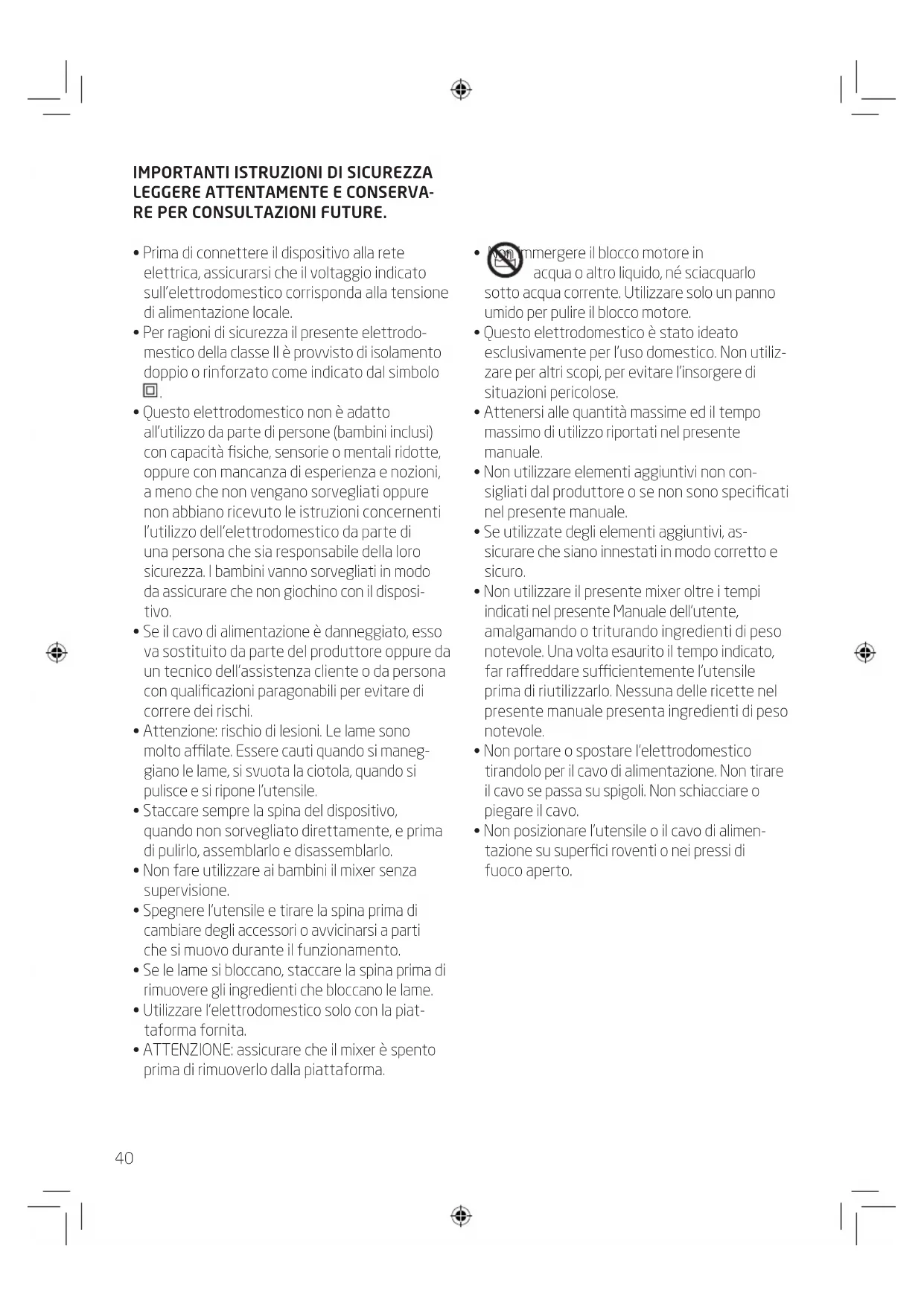 - Assicurare che il blocco motore e la scatola ingranaggi non entrino in contatto con alimenti o liquidi.