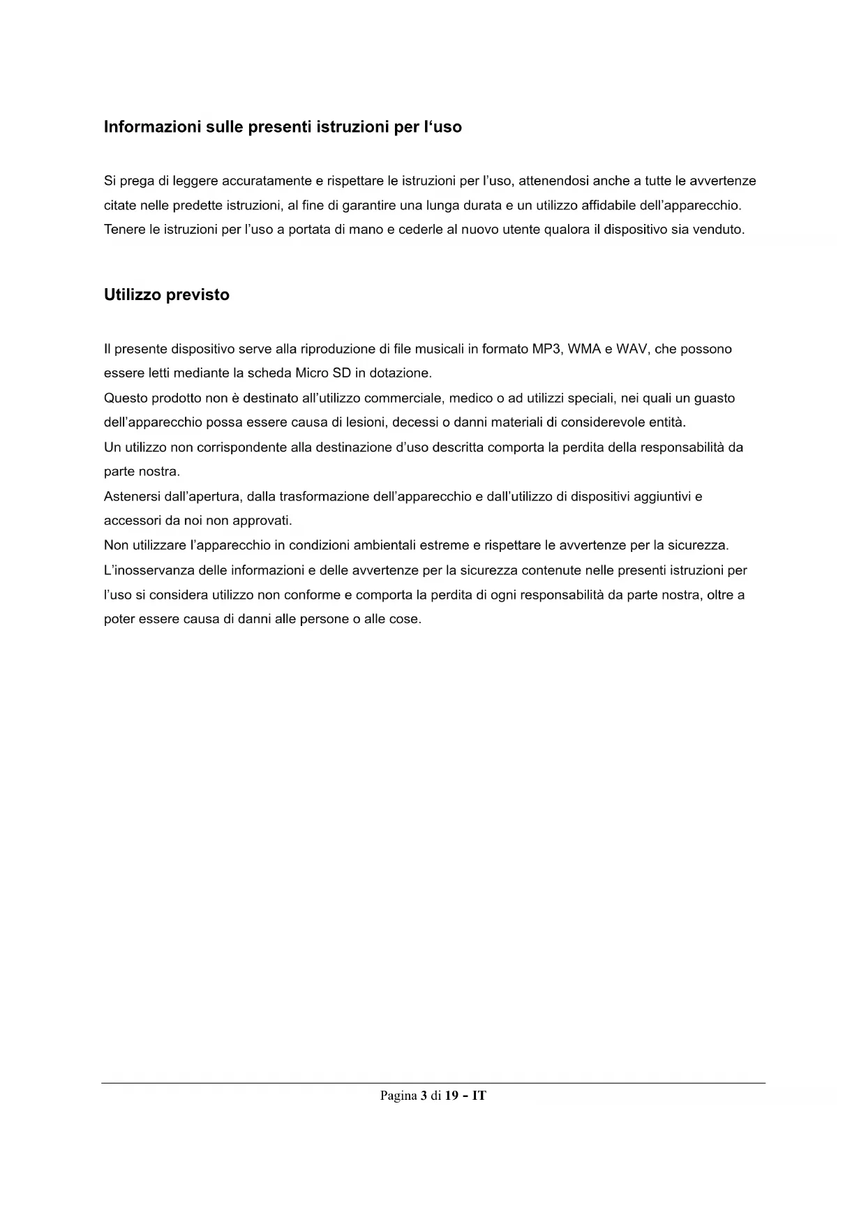AVVERTENZA: un’esposizione prolungata all’ascolto di musica troppo alta può causare danni temporanei o permanenti all’udito oppure persino la perdita dell’udito. Non si consiglia di utilizzare il video player nella circolazione stradale. Ciò può comportare che l’utente reagisca con disattenzione a potenziali rischi, come ad esempio veicoli in avvicinamento.Pagina 5 di 19 - IT