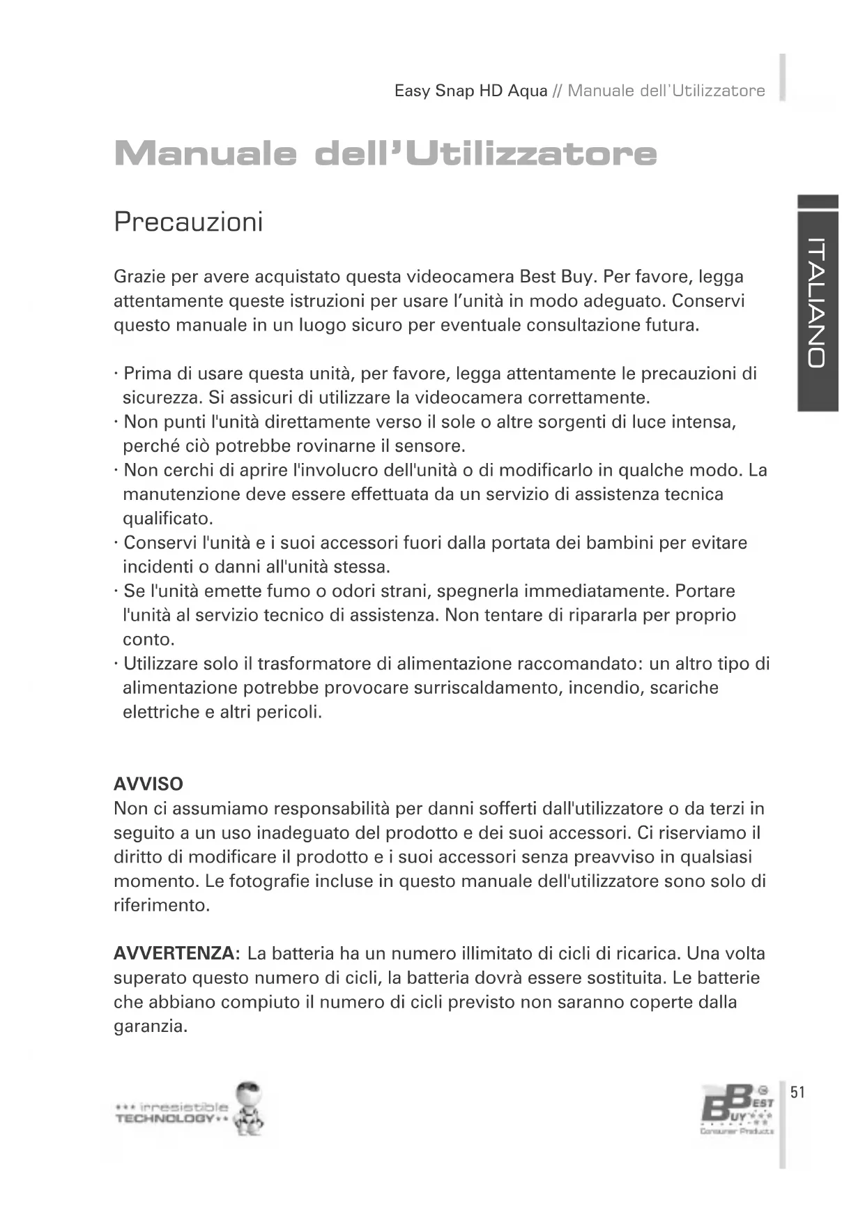 Manuale dell’Utilizzatore Precauzioni Grazie per avere acquistato questa videocamera Best Buy. Per favore, legga attentamente queste istruzioni per usare l’unità in modo adeguato. Conservi questo manuale in un luogo sicuro per eventuale consultazione futura.