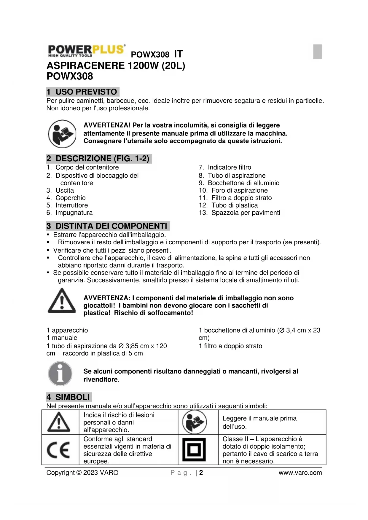 Copyright © 2023 VARO P a g . | 2 www.varo.com ASPIRACENERE 1200W (20L) POWX308 1 USO PREVISTO Per pulire caminetti, barbecue, ecc. Ideale inoltre per rimuovere segatura e residui in particelle. Non idoneo per l'uso professionale. AVVERTENZA! Per la vostra incolumità, si consiglia di leggere attentamente il presente manuale prima di utilizzare la macchina. Consegnare l’utensile solo accompagnato da queste istruzioni. 2 DESCRIZIONE (FIG. 1-2)