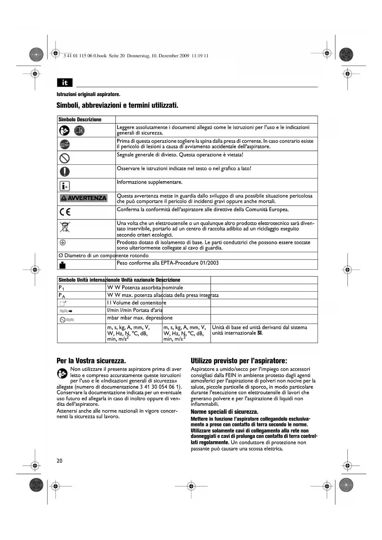 Istruzioni originali aspiratore. Simboli, abbreviazioni e termini utilizzati. Per la Vostra sicurezza. Non utilizzare il presente aspiratore prima di aver letto e compreso accuratamente queste istruzioni per l’uso e le «Indicazioni generali di sicurezza» allegate (numero di documentazione 3 41 30 054 06 1). Conservare la documentazione indicata per un eventuale uso futuro ed allegarla in caso di inoltro oppure di ven- dita dell’aspiratore. Attenersi anche alle norme nazionali in vigore concer- nenti la sicurezza sul lavoro. Utilizzo previsto per l’aspiratore: Aspiratore a umido/secco per l’impiego con accessori consigliati dalla FEIN in ambiente protetto dagli agenti atmosferici per l’aspirazione di polveri non nocive per la salute, piccole particelle di sporco, in modo particolare durante l’esecuzione con elettroutensile di lavori che generano polvere e per l’aspirazione di liquidi non infiammabili. Norme speciali di sicurezza. Mettere in funzione l’aspiratore collegandolo esclusiva- mente a prese con contatto di terra secondo le norme. Utilizzare solamente cavi di collegamento alla rete non danneggiati e cavi di prolunga con contatto di terra control- lati regolarmente. Un conduttore di protezione non passante può causare una scossa elettrica. Simbolo Descrizione Leggere assolutamente i documenti allegati come le istruzioni per l’uso e le indicazioni generali di sicurezza. Prima di questa operazione togliere la spina dalla presa di corrente. In caso contrario esiste il pericolo di lesioni a causa di avviamento accidentale dell’aspiratore. Segnale generale di divieto. Questa operazione è vietata! Osservare le istruzioni indicate nel testo o nel grafico a lato! Informazione supplementare. Questa avvertenza mette in guardia dallo sviluppo di una possibile situazione pericolosa che può comportare il pericolo di incidenti gravi oppure anche mortali. Conferma la conformità dell’aspiratore alle direttive della Comunità Europea. Una volta che un elettroutensile o un qualunque altro prodotto elettrotecnico sarà diven- tato inservibile, portarlo ad un centro di raccolta adibito ad un riciclaggio eseguito secondo criteri ecologici. Prodotto dotato di isolamento di base. Le parti conduttrici che possono essere toccate sono ulteriormente collegate al cavo di guardia. Ø Diametro di un componente rotondo Peso conforme alla EPTA-Procedure 01/2003 Simbolo Unità internazionale Unità nazionale Descrizione